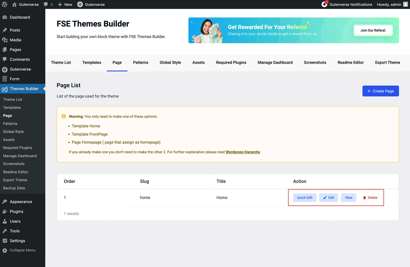 Displays all the pages that are part of this theme, allowing you to view and manage them easily.