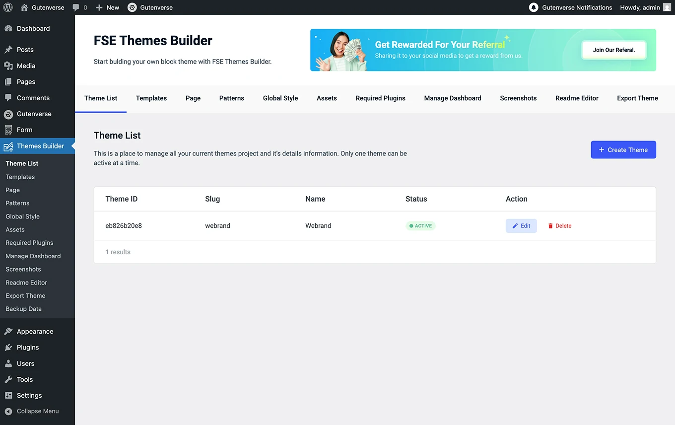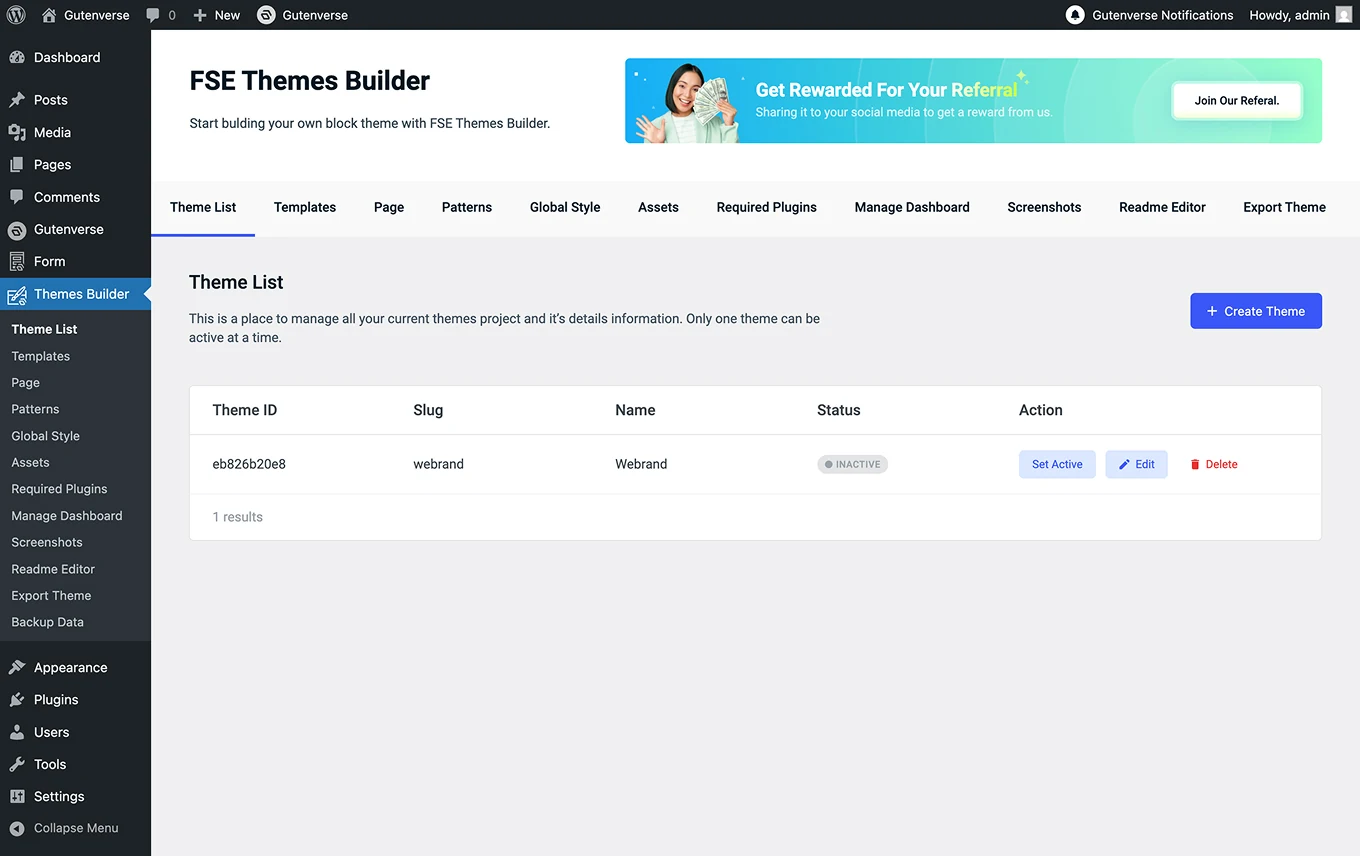 This is a place to manage all your current themes project and it’s details information. Only one theme can be active at a time.