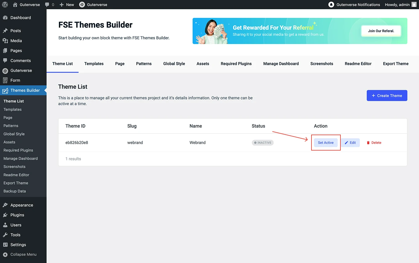In this section, you’ll find a Set Active button that allows you to enable the theme you’ve created earlier. This step is essential because, when adding templates later, you’ll need to select an active theme to associate them with.