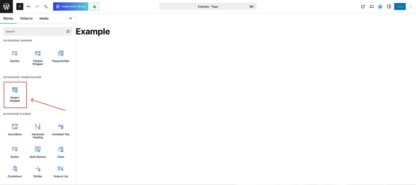 Once inside the editor, click the Plus (+) icon, then under the Blocks tab, select the Pattern Wrapper block.