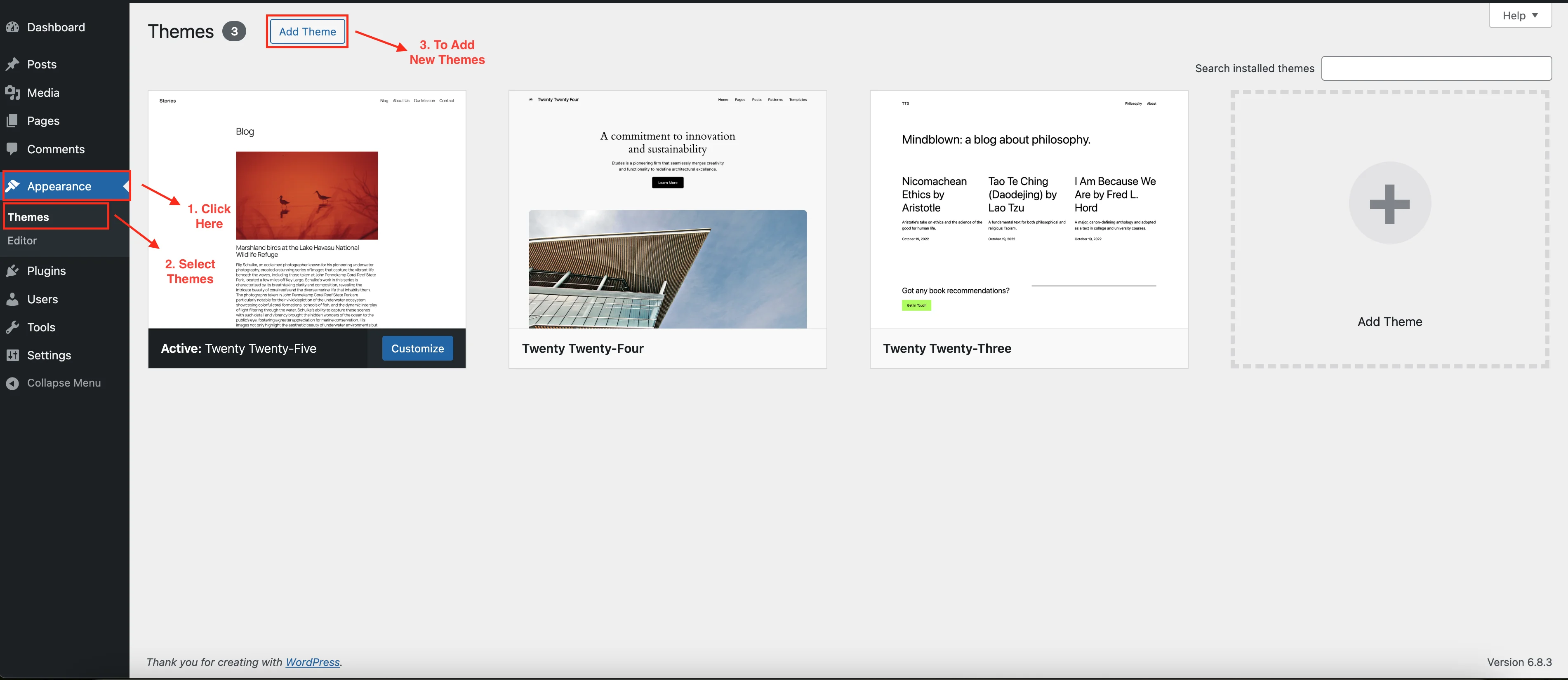 To do this, navigate to Appearance → Themes, then click the Add Theme button at the top of the page.