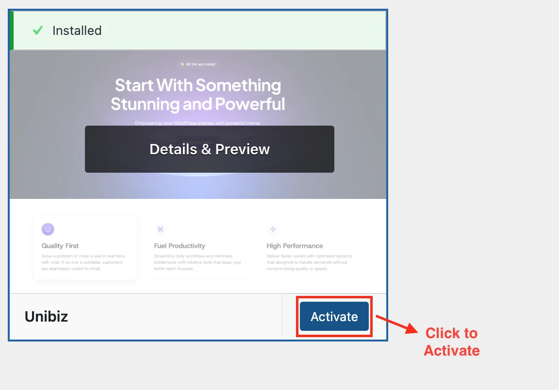 Once the theme file has been uploaded, click the Install Now button. After the installation is complete, click Activate link to enable the Unibiz theme.