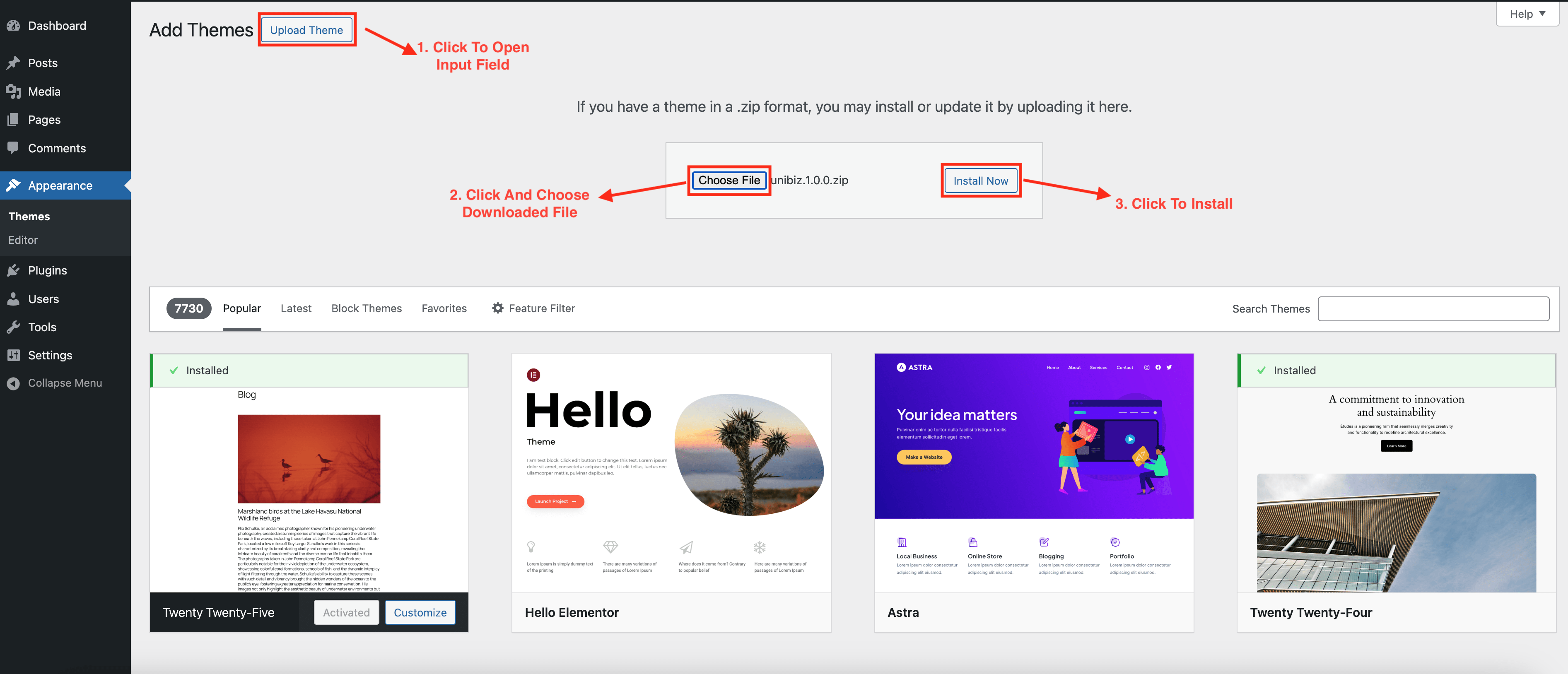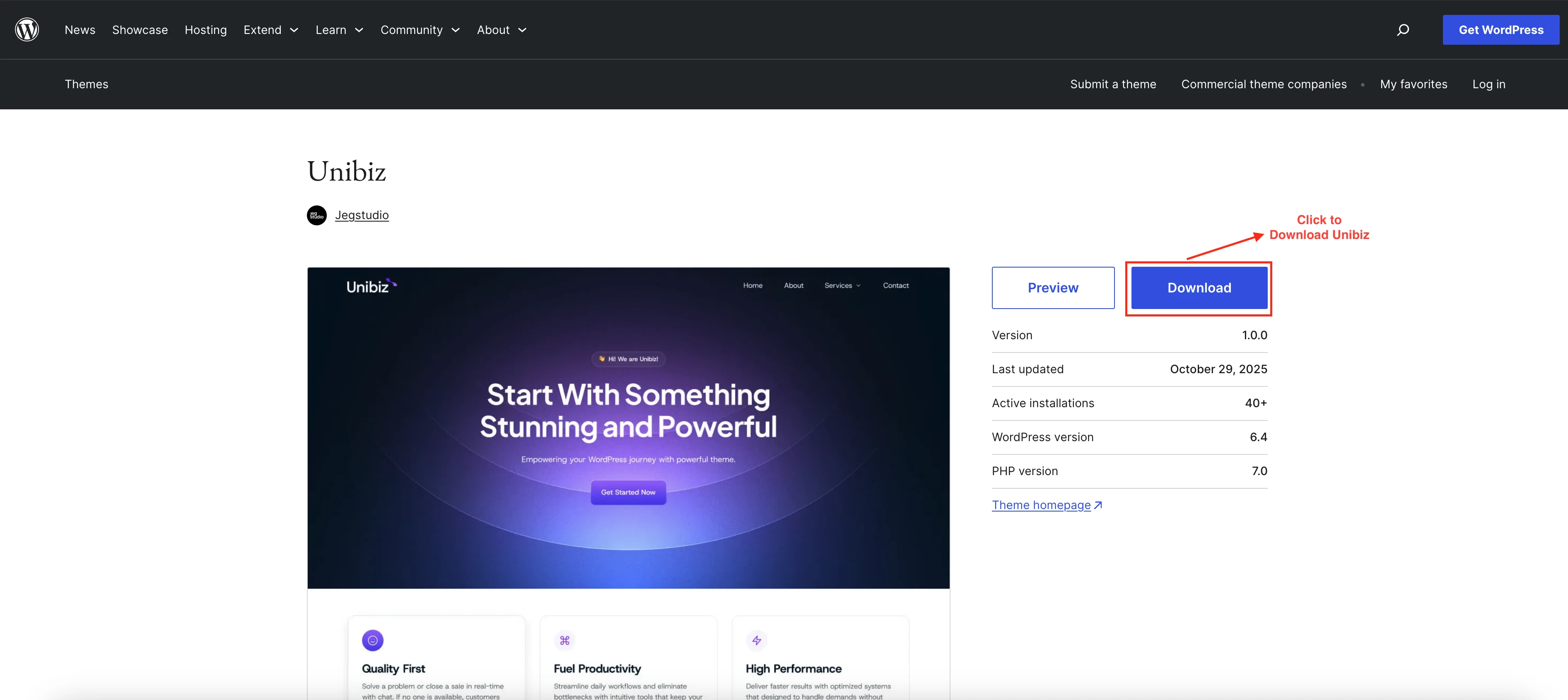 You can also install the Unibiz theme manually by downloading it from WordPress.org and uploading it to your WordPress dashboard. Follow the steps below to get started.