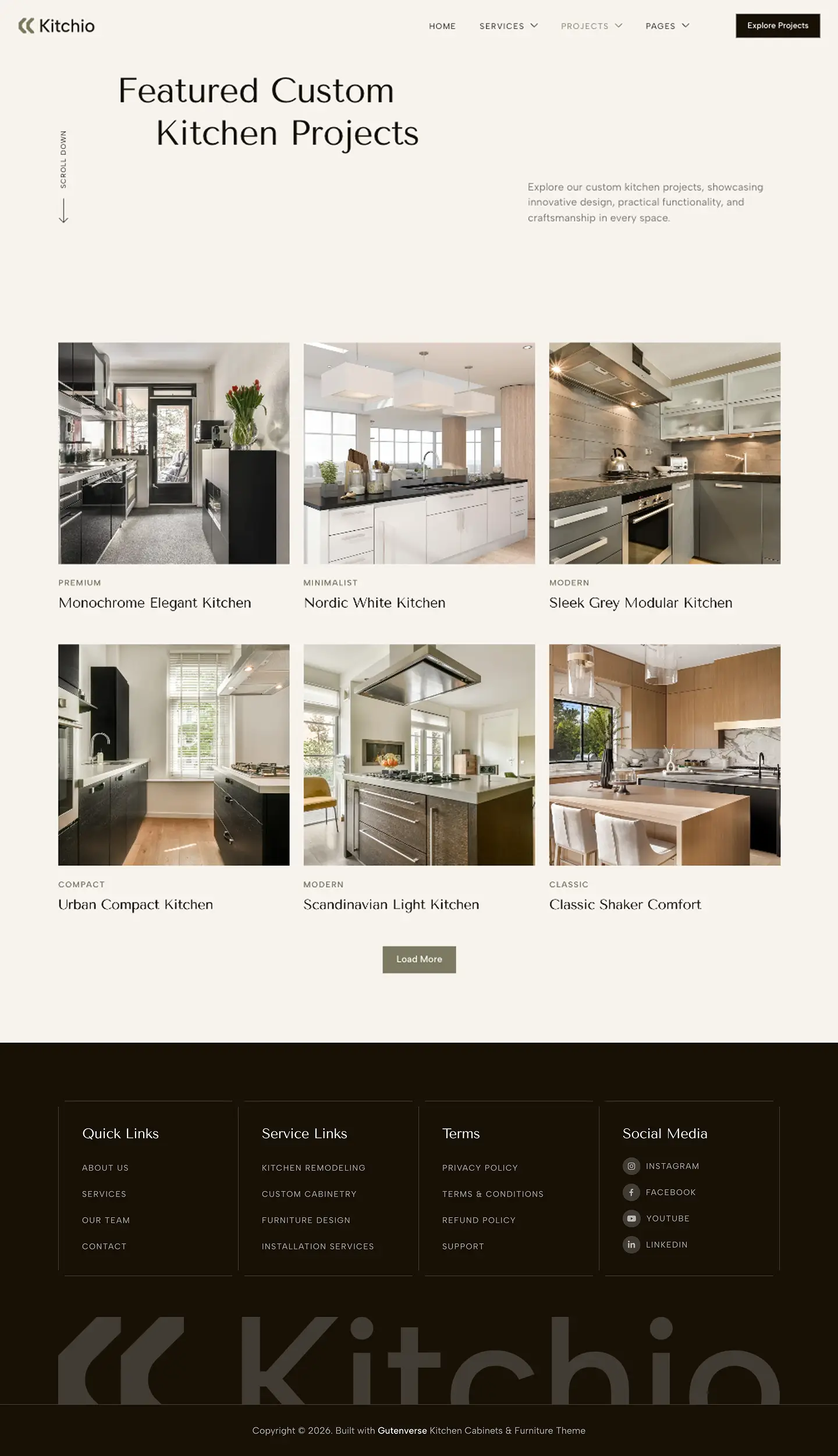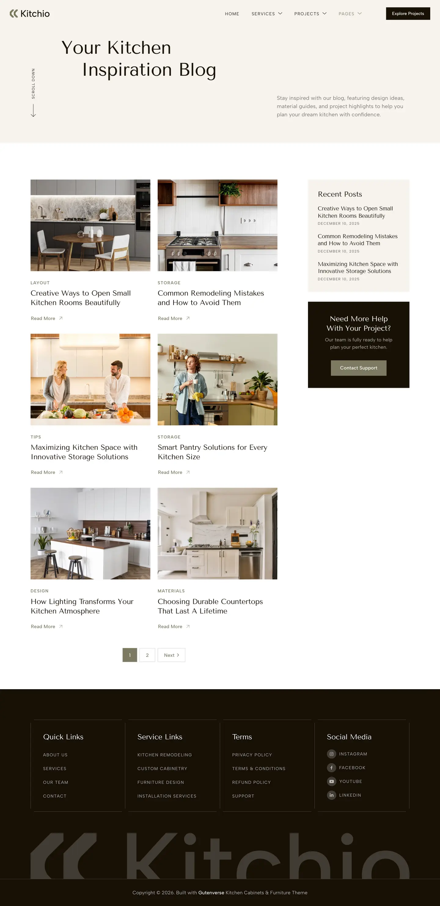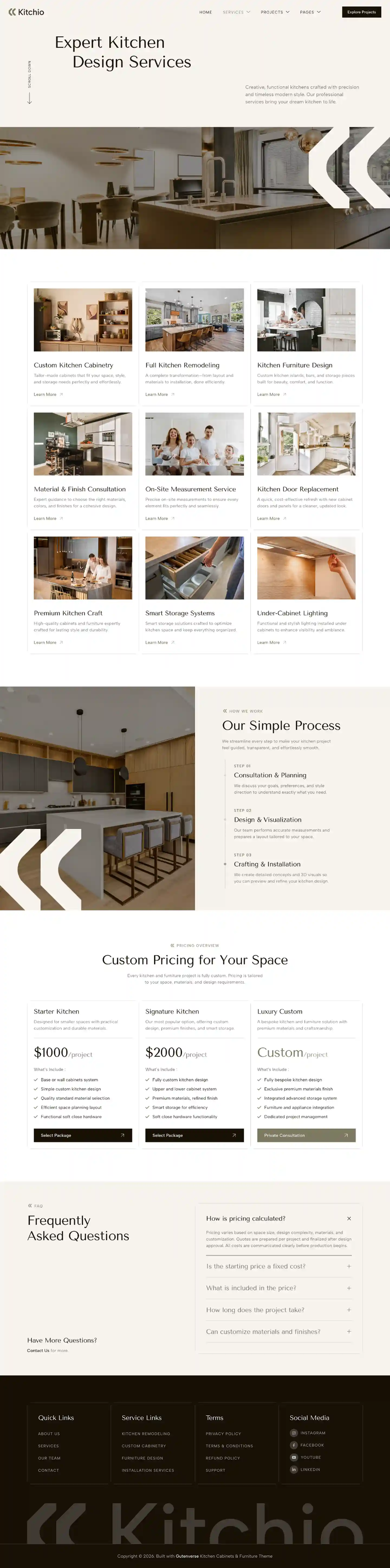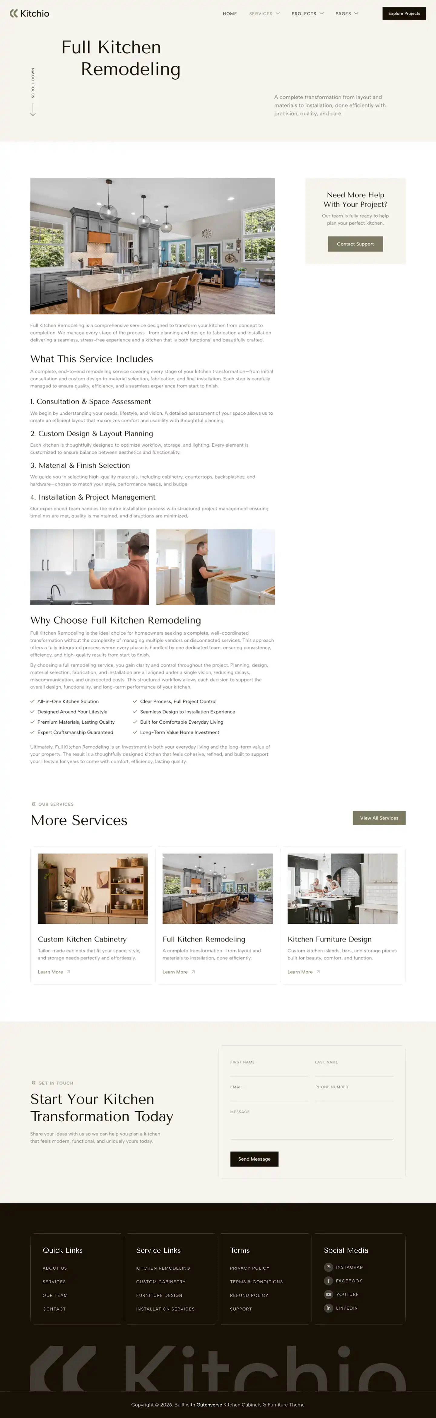 Kitchio PRO is a Full Site Editing (FSE) Gutenverse theme crafted for kitchen-focused businesses that value clarity, craftsmanship, and visual impact. Built for kitchen studios, cabinet makers, interior designers, furniture brands, and custom woodworking professionals, Kitchio enables you to present your work with confidence.
