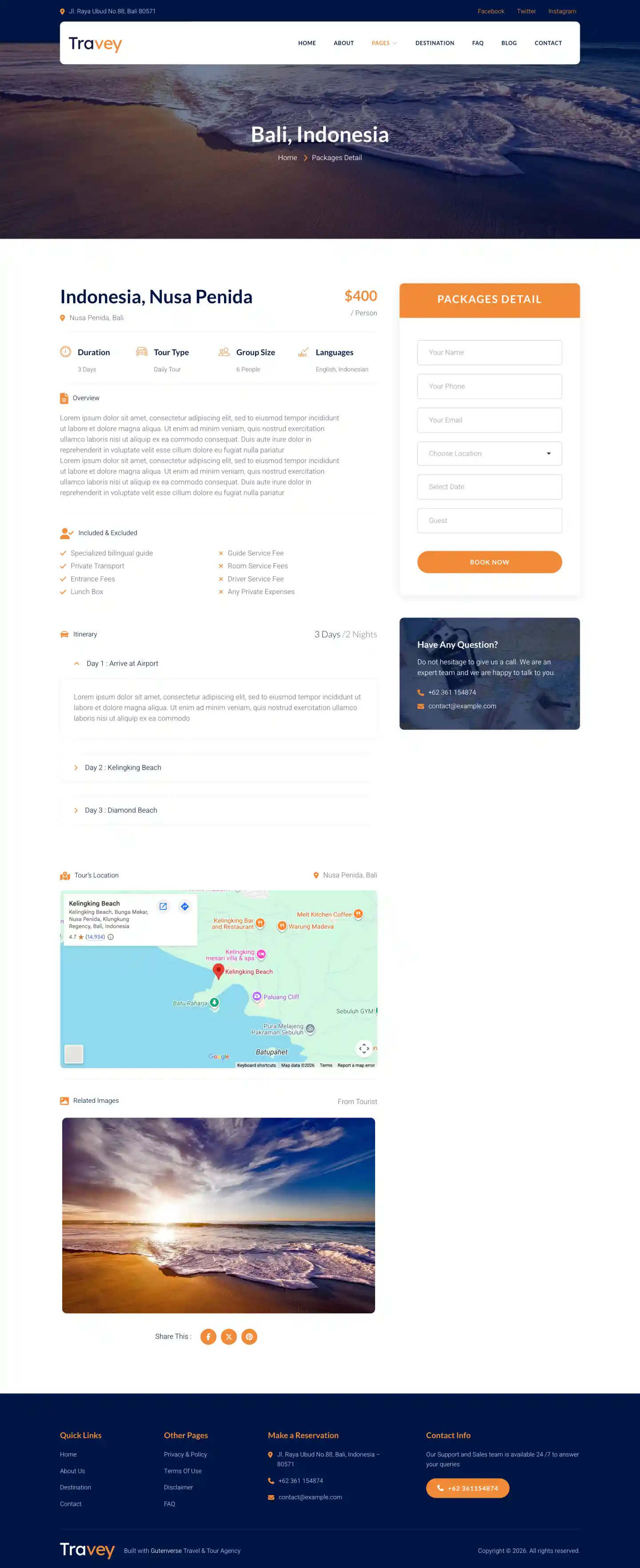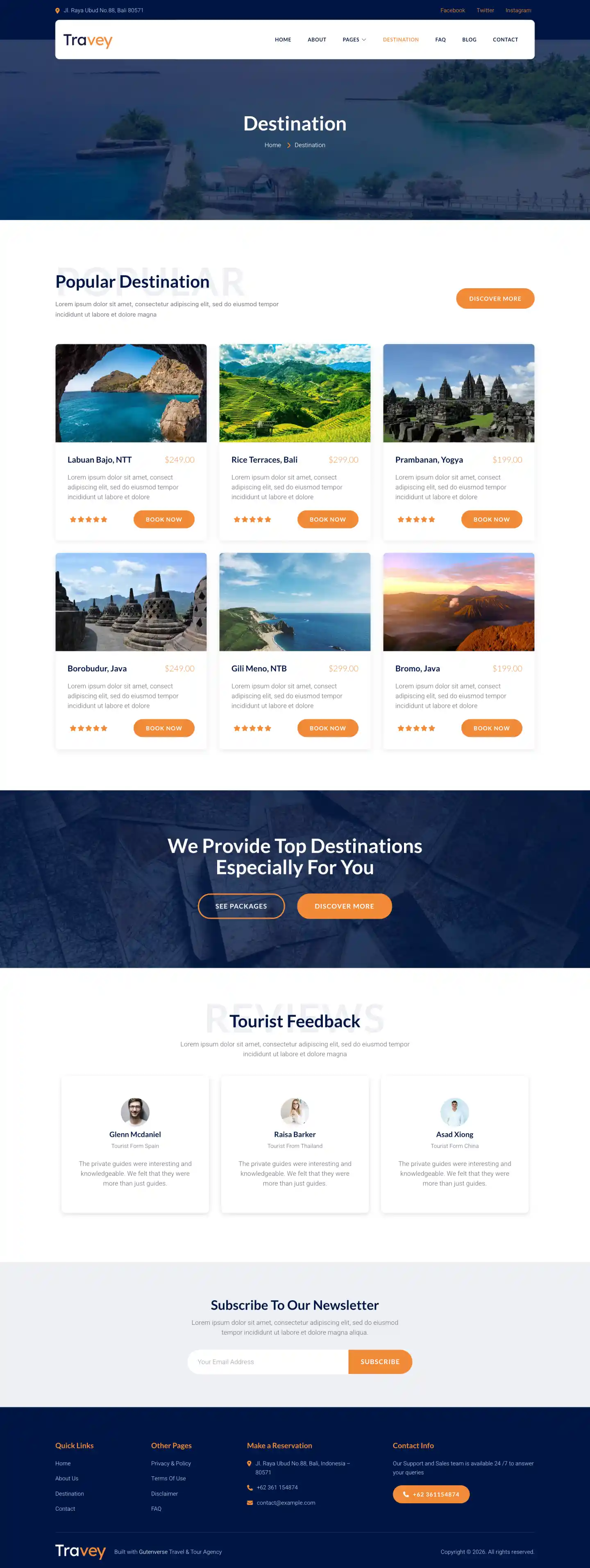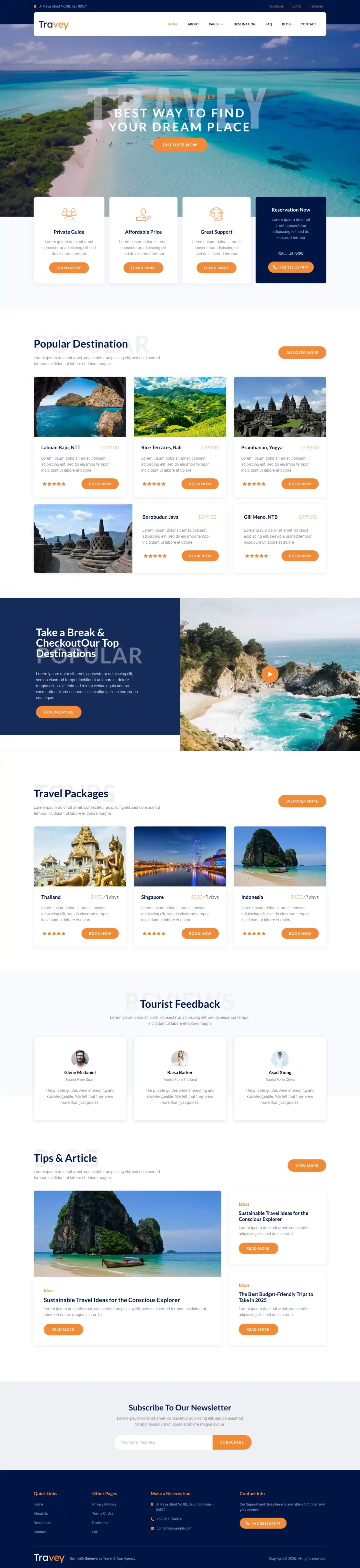 Travey PRO is a simple, responsive, and elegant looking theme template for WordPress fullsite editing and fully compatible with Gutenverse plugin. Travey’s created especially for Travel Agency, Tour Operator, Adventurer, Tourism, Destination Trips, Holiday and other similar businesses. The templates includes both core version and Gutenverse plugin version, also has core and Gutenverse block patterns ready so you can start mix and match your template parts as you desire. The templates is built ready so you don't need to build it from scratch. We want to make your experience using WordPress fullsite editor more convenient.