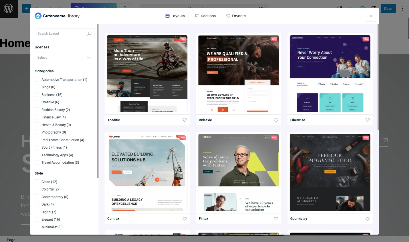 Open the Gutenverse template library from your WordPress dashboard. Browse templates by industry, style, or category. Filter by business type, portfolio, blog, or other categories to find what matches your project.