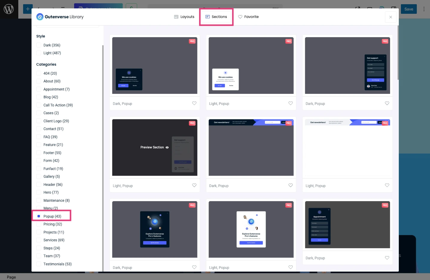 Inside the Gutenverse Template Library, go to the Sections tab and select the Popup category. There, you will find a variety of popup templates designed for different purposes, such as announcements, subscriptions, or promotions. Each template is built with flexibility, so it can easily adapt to your site’s existing layout and style.