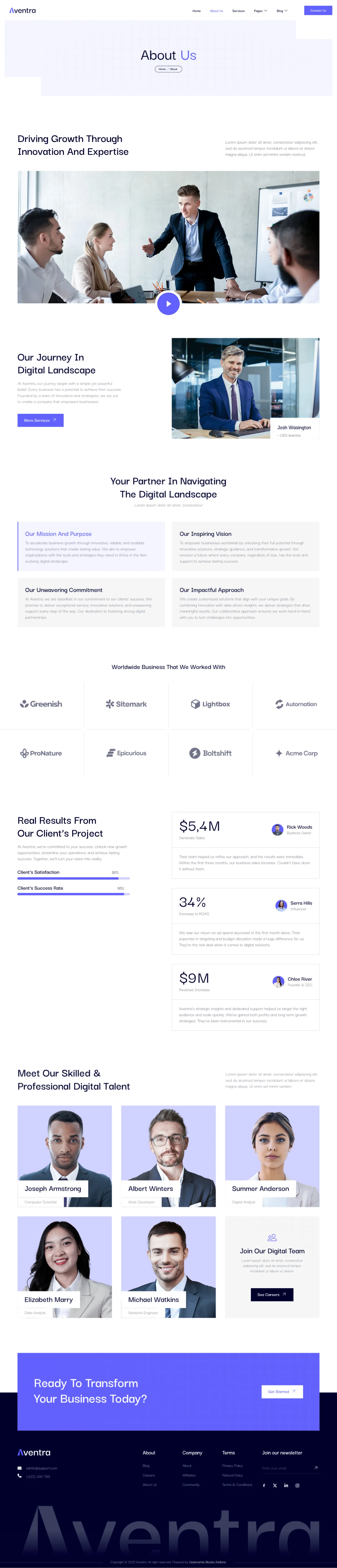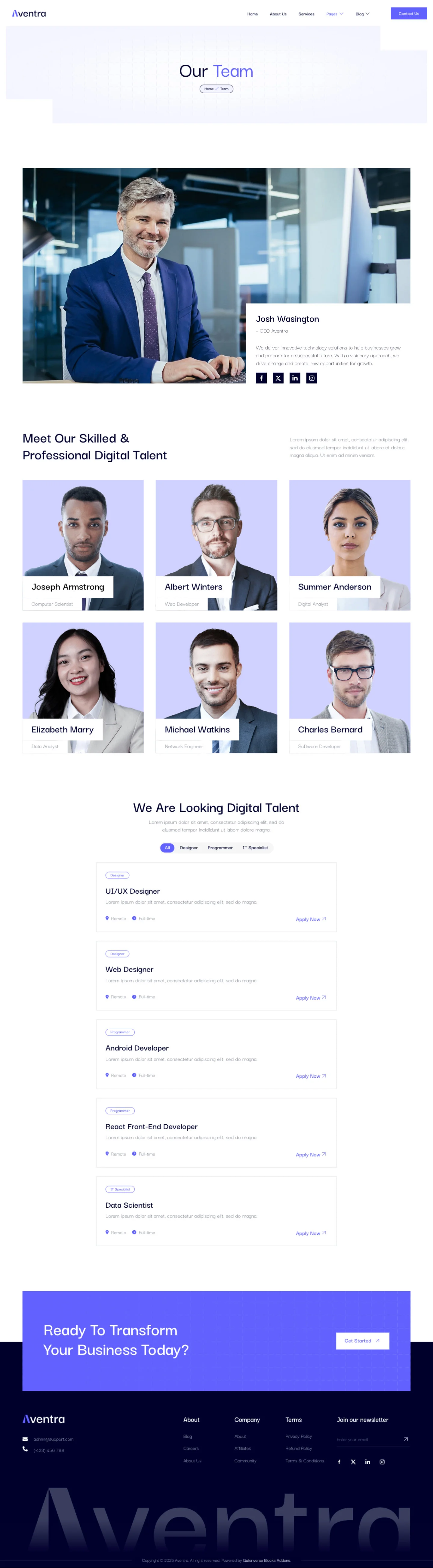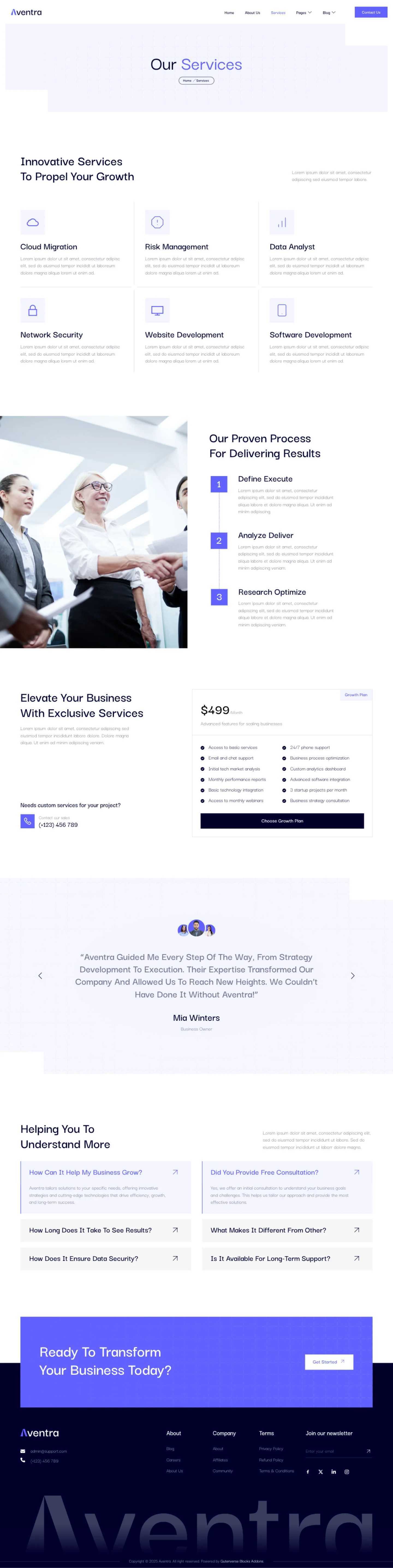 Aventra brings a clean and modern design, perfect for creating professional websites for startups, agencies, consultants, and corporate firms. With its versatile layout and fully responsive structure, Aventra adapts seamlessly to all screen sizes helping your business make a strong and lasting impression online.