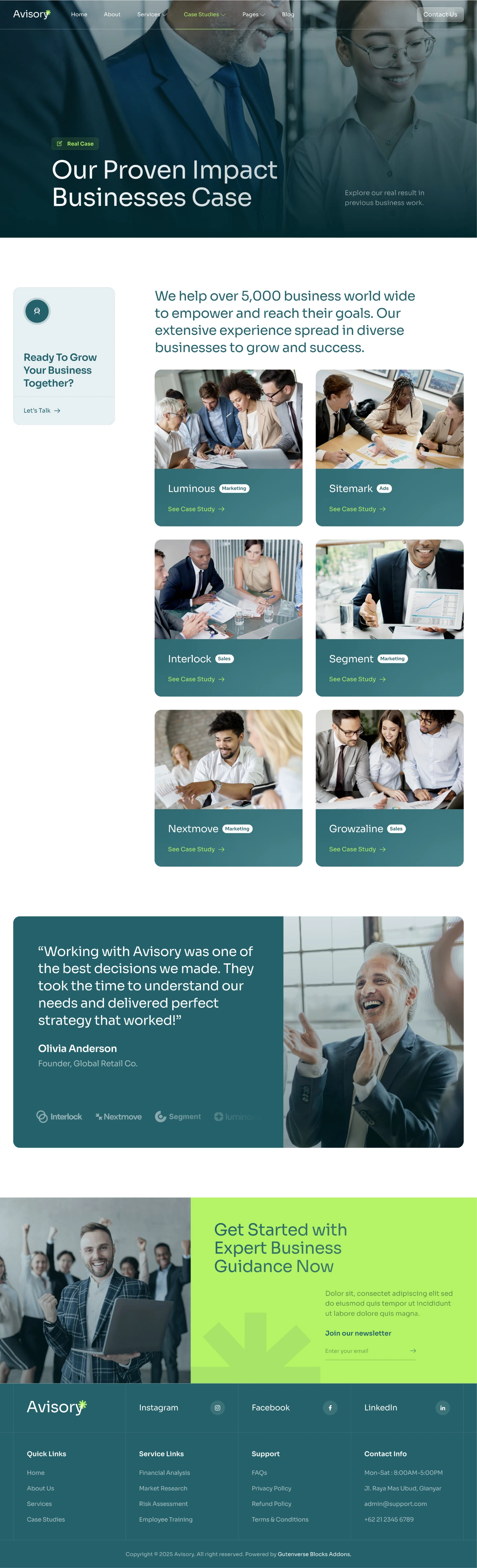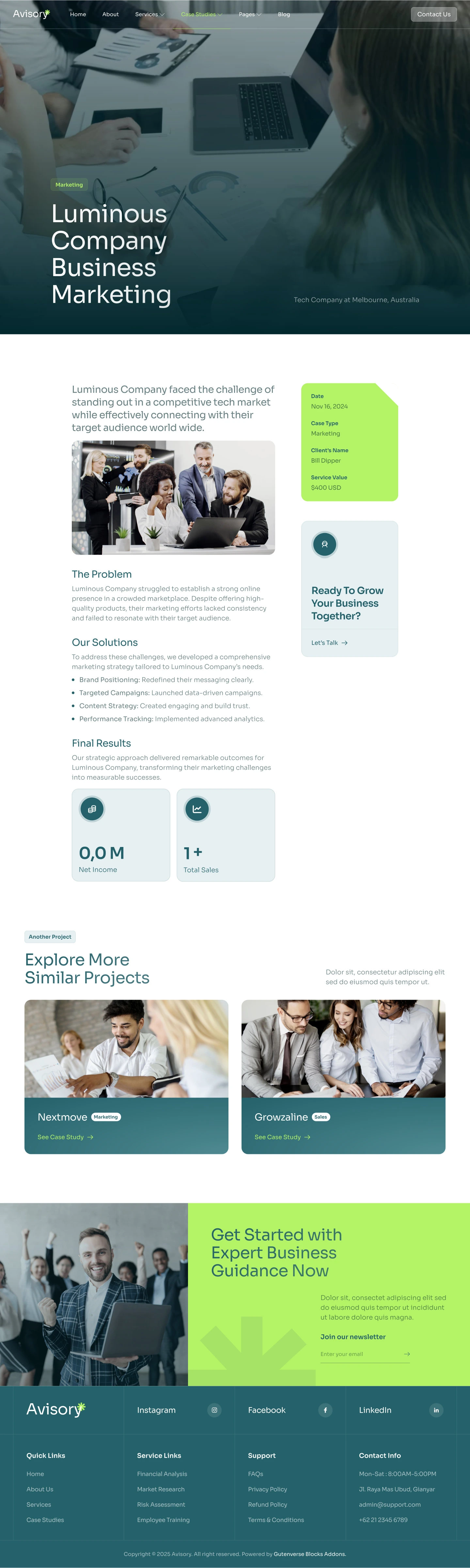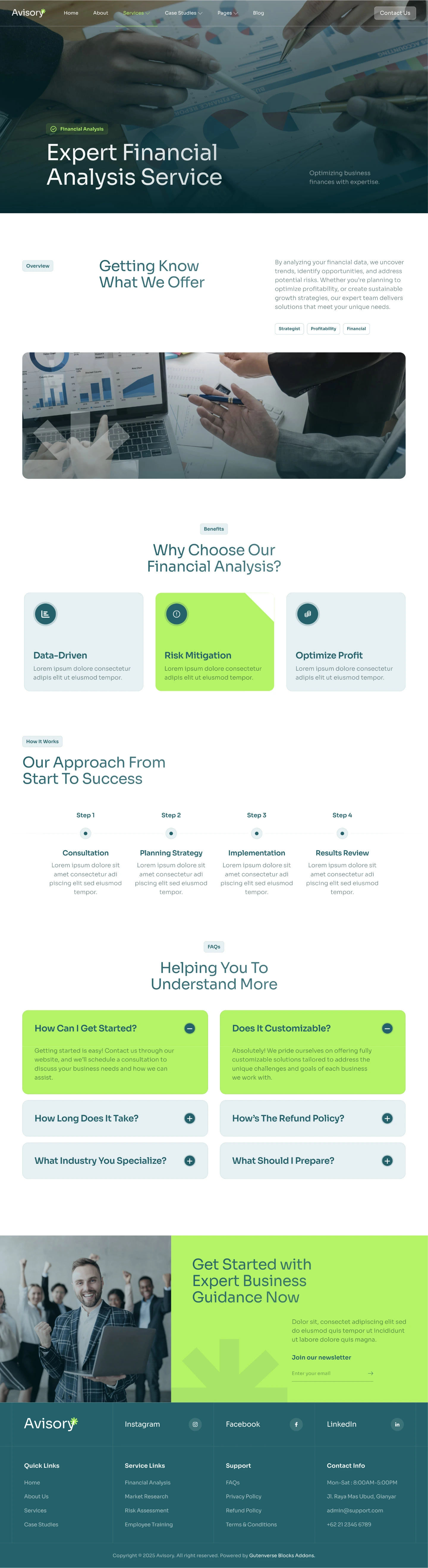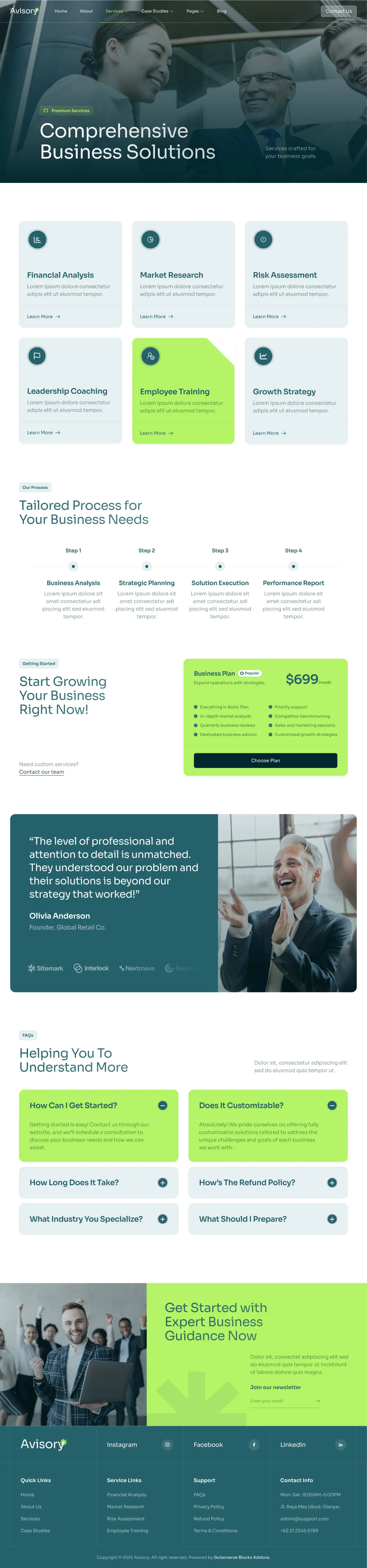 Avisory delivers a modern and professional design, perfect for finance advisors, consultants, and corporate firms. Its clean, unique layout builds trust, showcases expertise, and ensures a seamless browsing experience across all devices helping you connect with clients and elevate your brand.