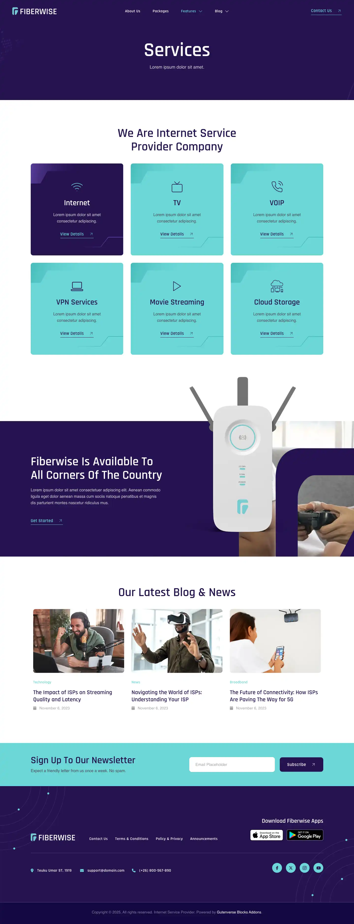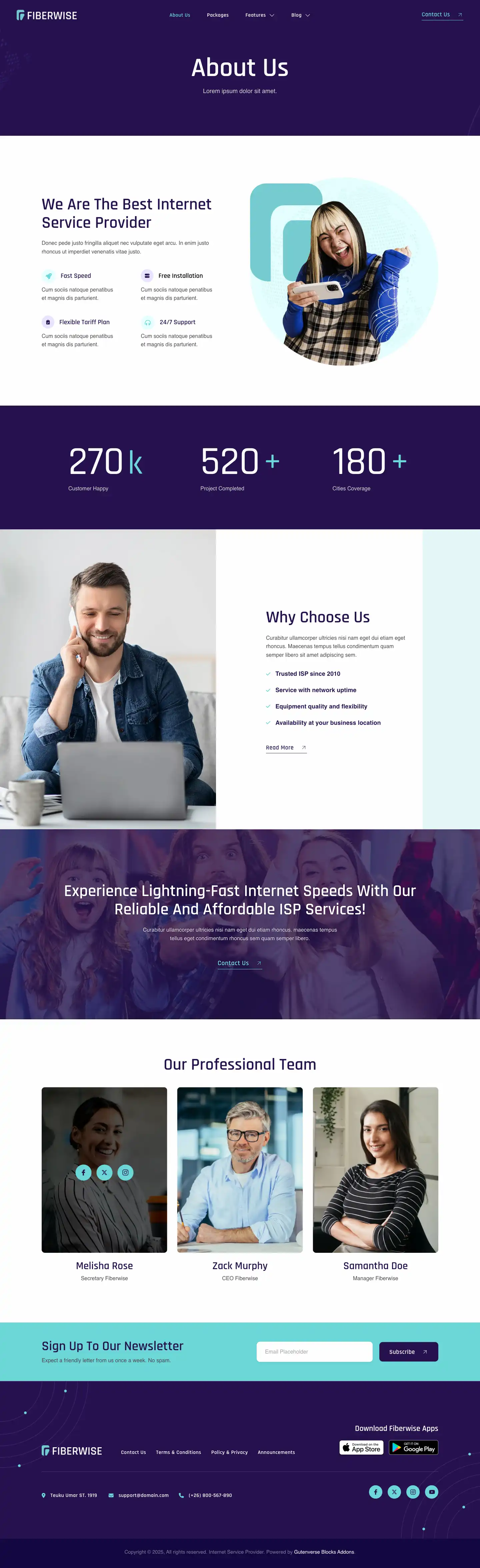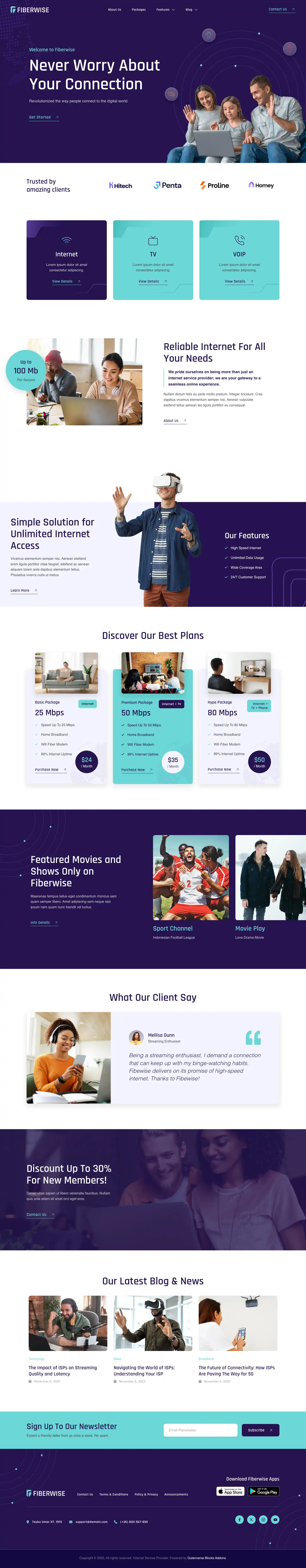 Fiberwise features a modern and dynamic design, perfect for creating professional websites for internet service providers and telecom companies. Ideal for broadband providers, fiber optic services, wireless internet companies, and network solution firms. Fiberwise helps you showcase your plans, highlight your coverage, and build trust with customers looking for fast and reliable connectivity.
