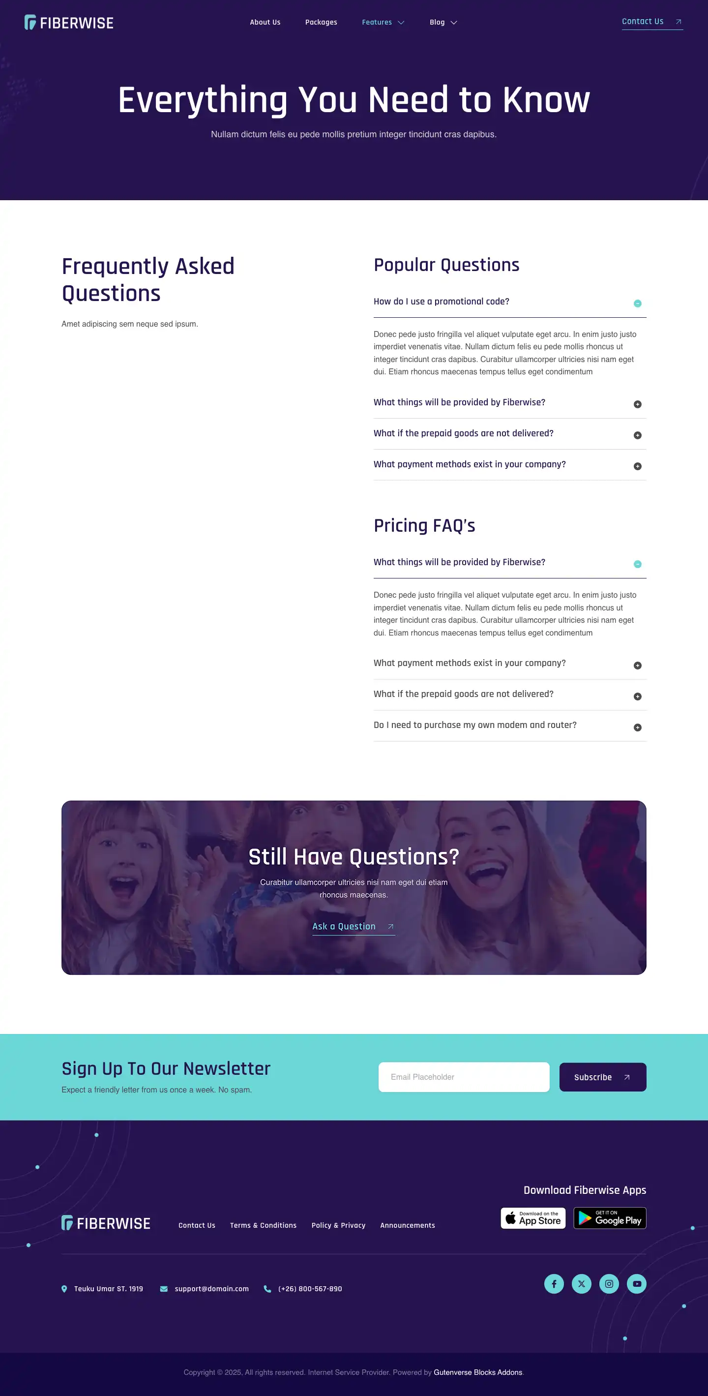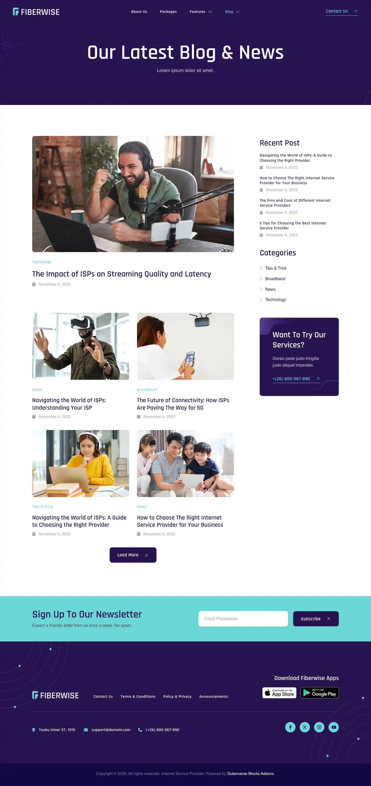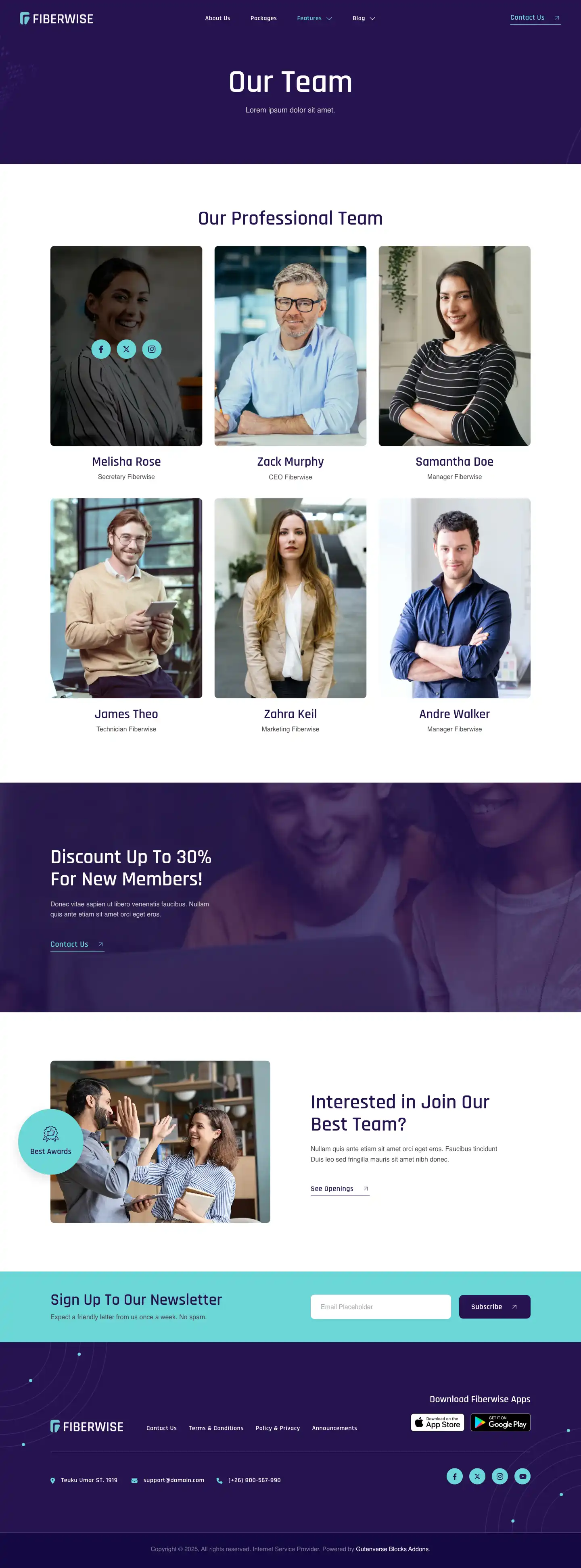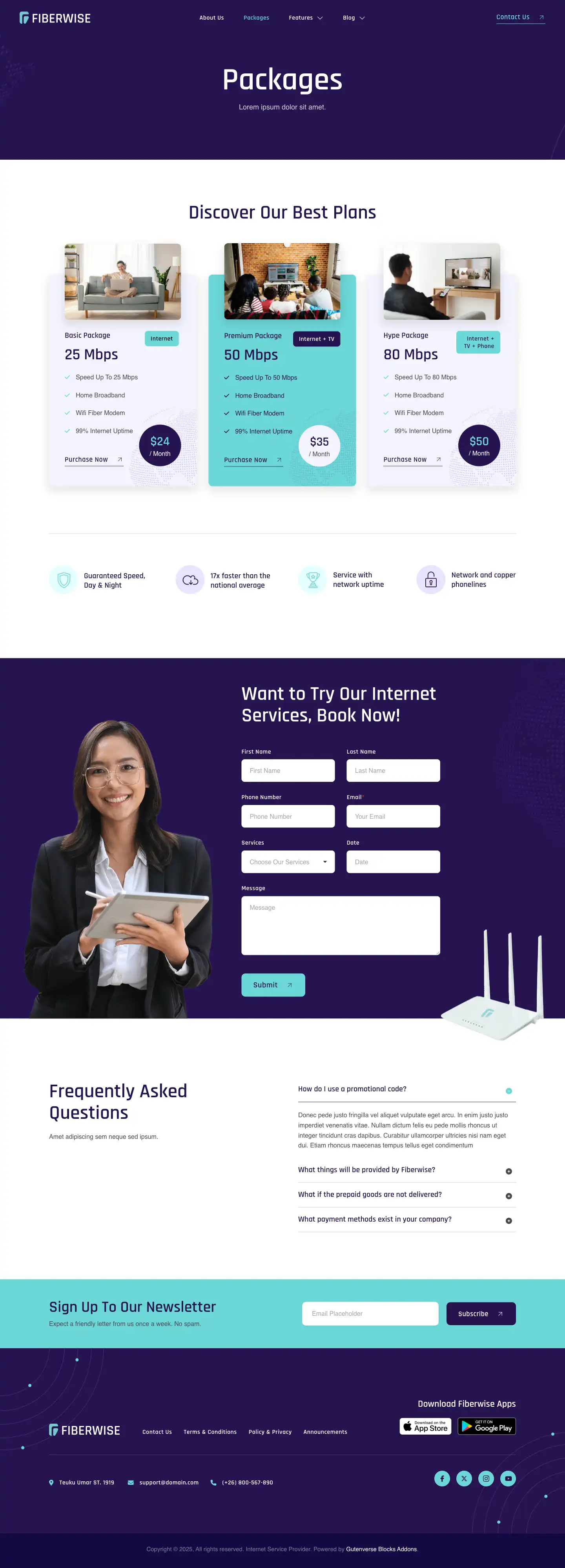 Fiberwise features a modern and dynamic design, perfect for creating professional websites for internet service providers and telecom companies. Ideal for broadband providers, fiber optic services, wireless internet companies, and network solution firms. Fiberwise helps you showcase your plans, highlight your coverage, and build trust with customers looking for fast and reliable connectivity.