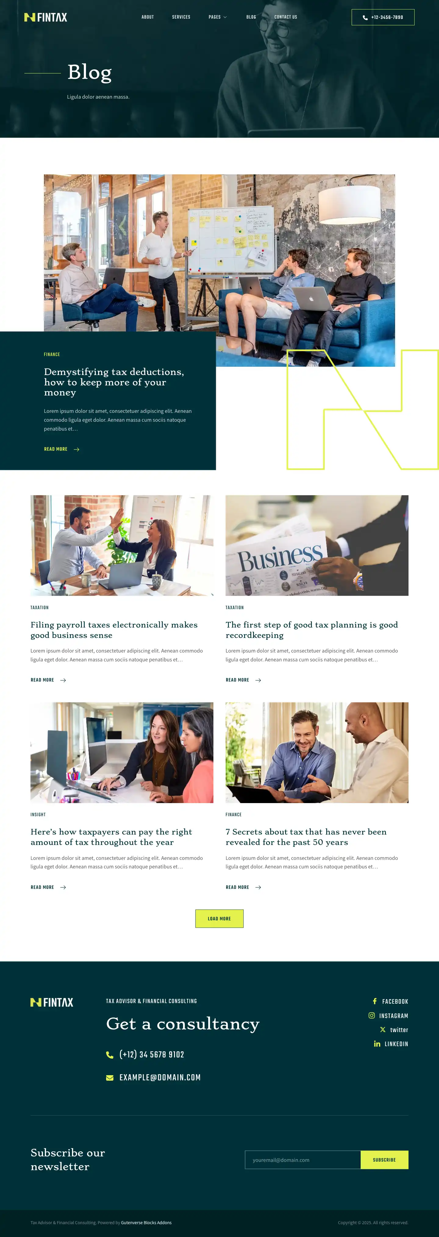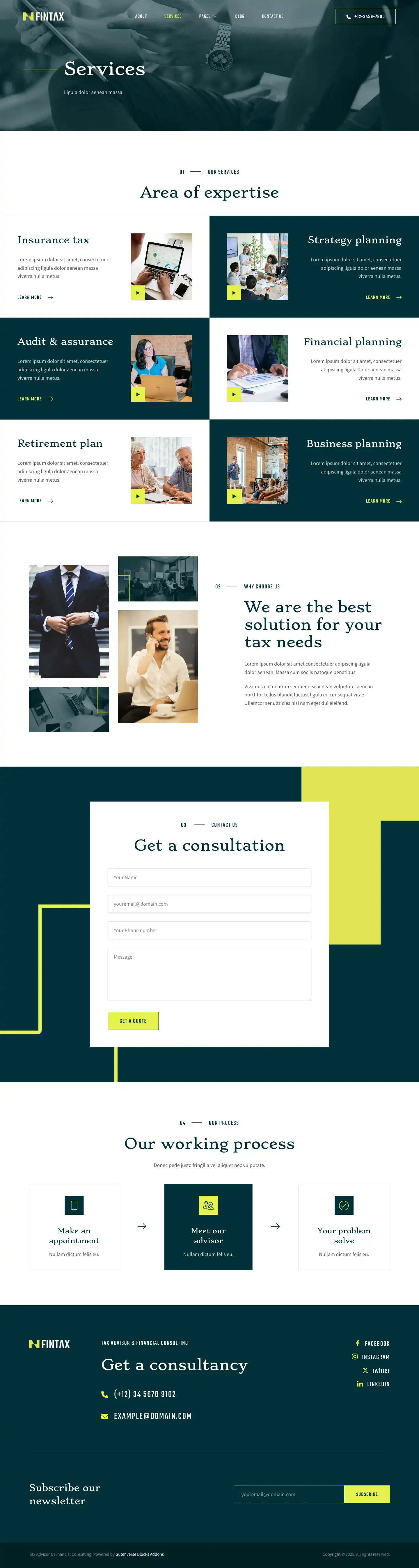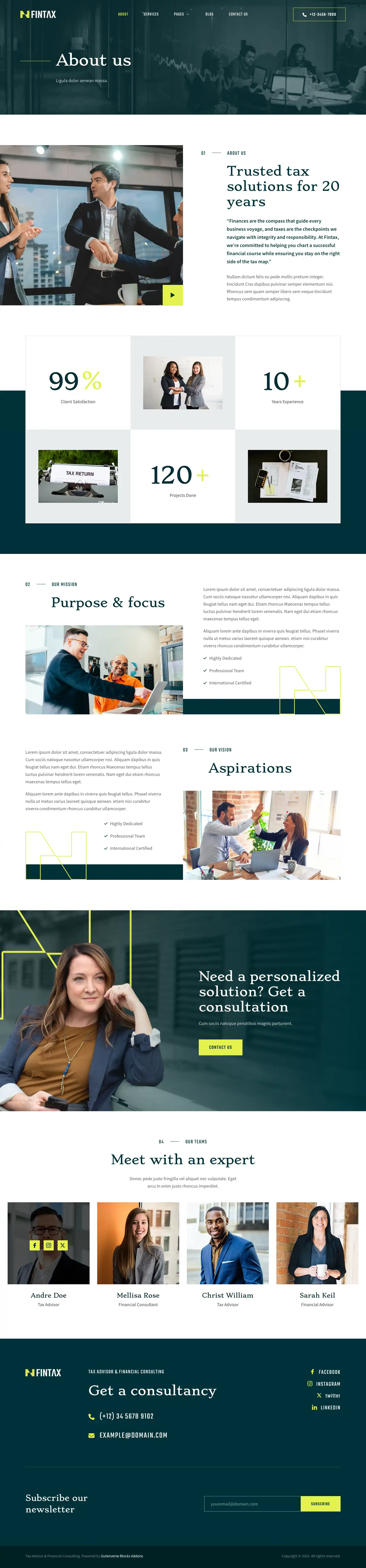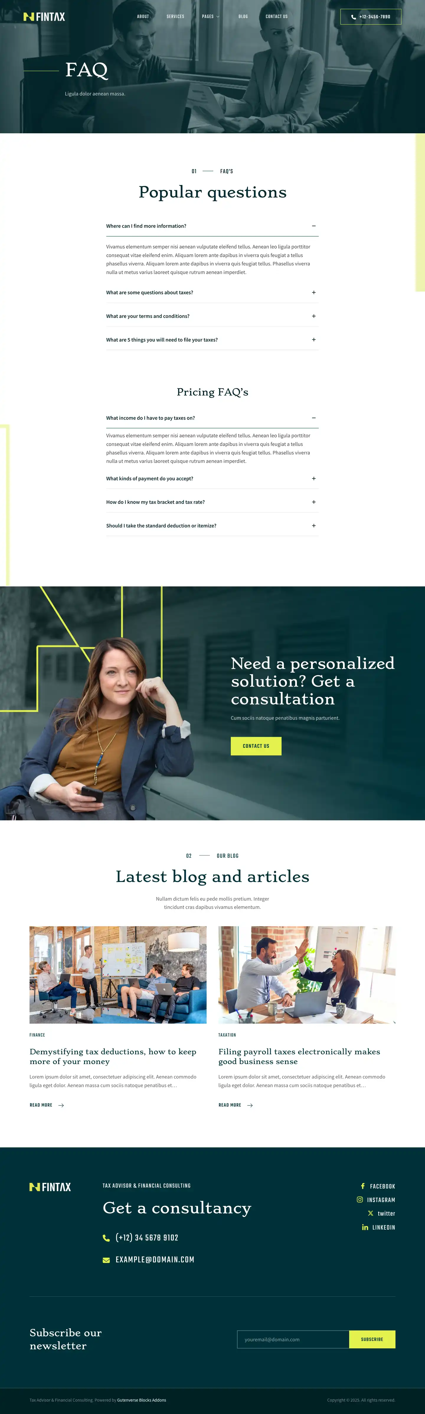 Fintax delivers a clean and professional design, perfect for building websites for tax advisory and financial consulting services. Ideal for tax advisors, accountants, financial planners, auditing firms, and corporate finance consultants. Fintax helps you present your expertise, simplify complex information, and build trust with clients seeking reliable tax and financial solutions.