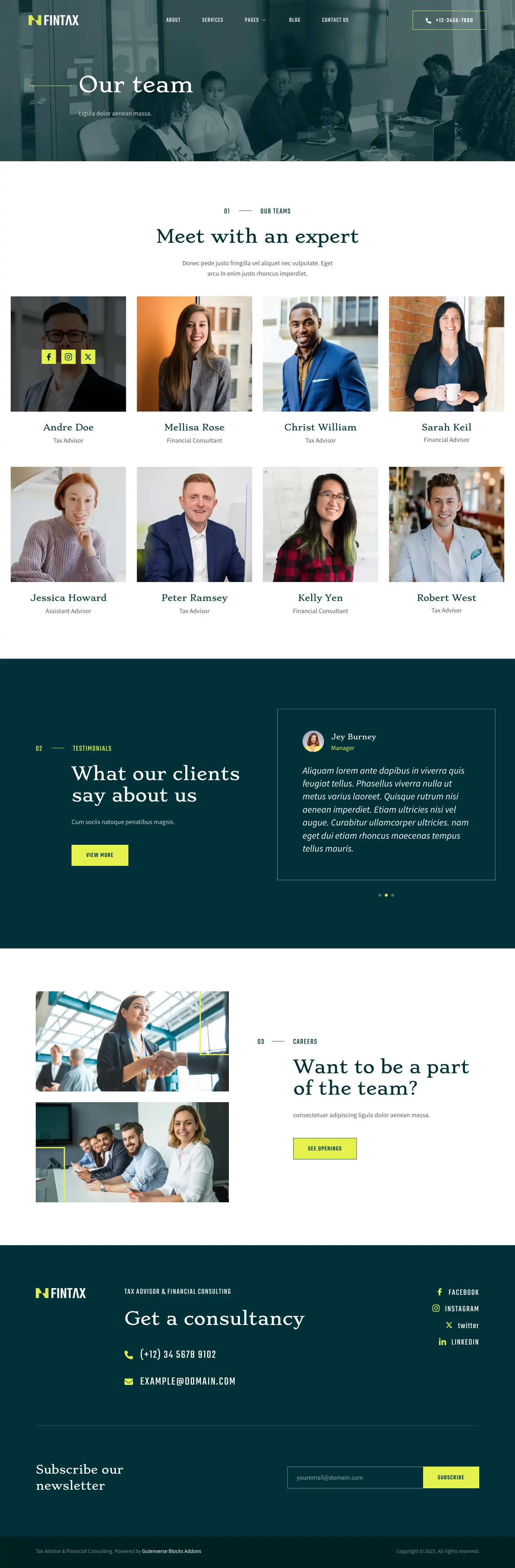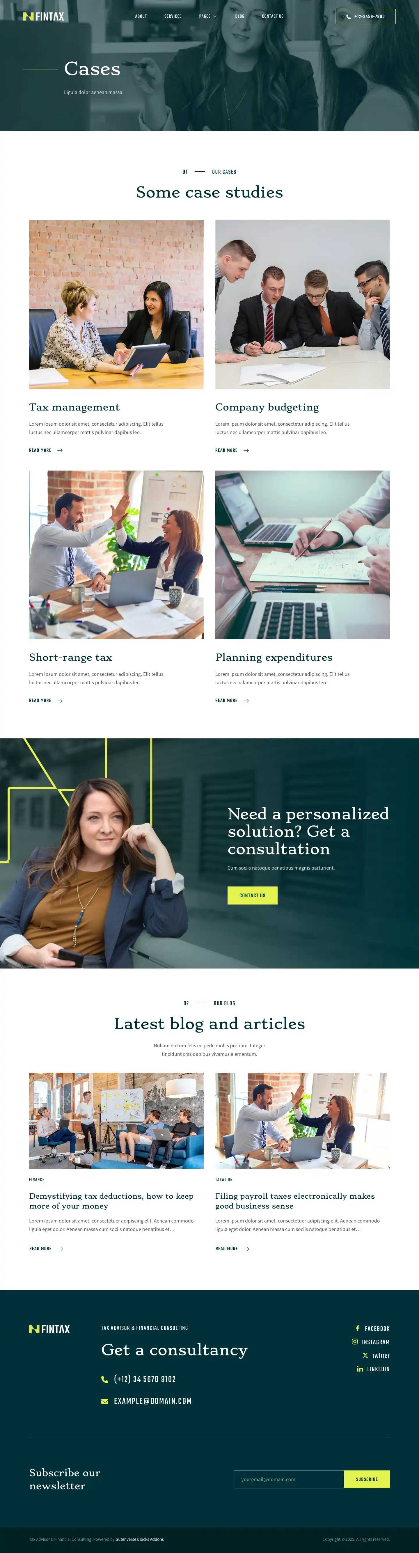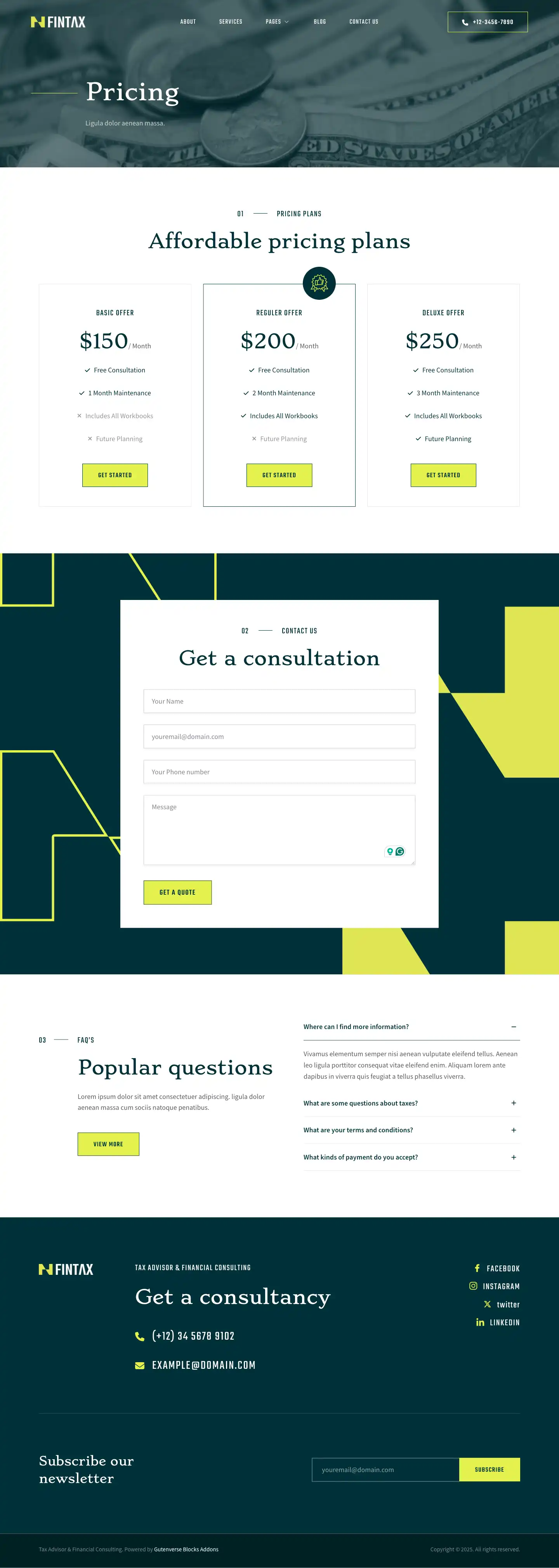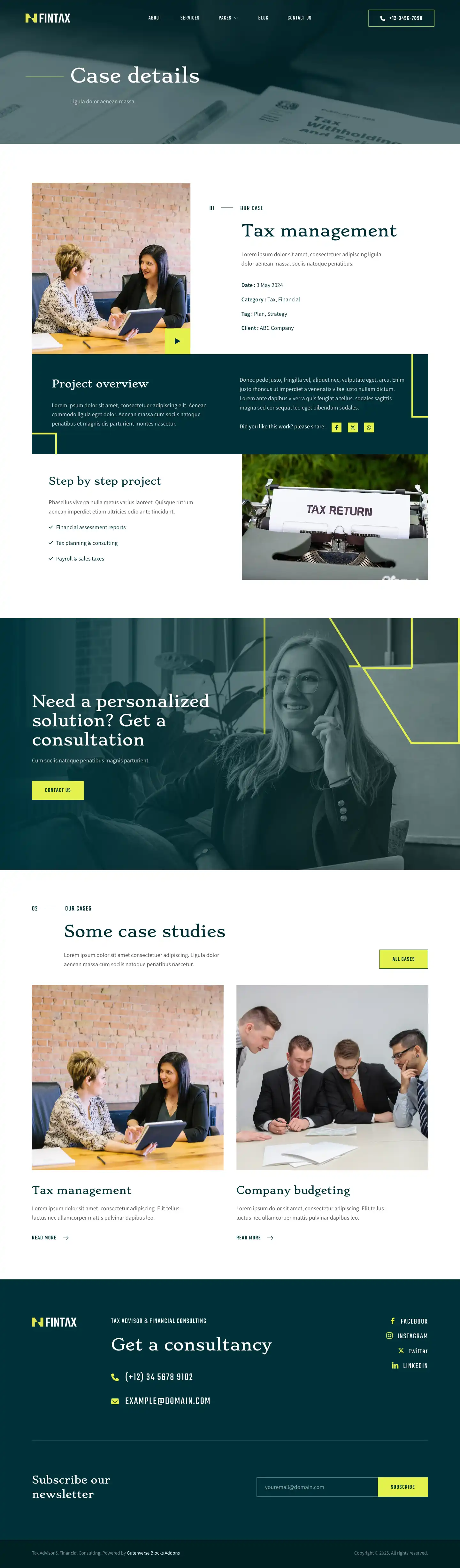 Fintax delivers a clean and professional design, perfect for building websites for tax advisory and financial consulting services. Ideal for tax advisors, accountants, financial planners, auditing firms, and corporate finance consultants. Fintax helps you present your expertise, simplify complex information, and build trust with clients seeking reliable tax and financial solutions.