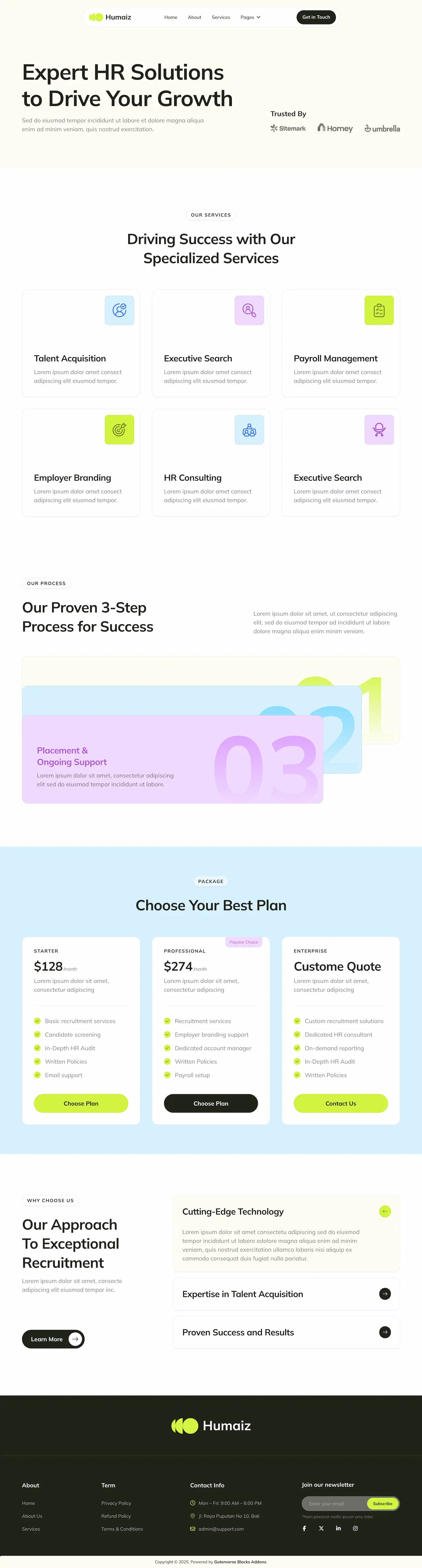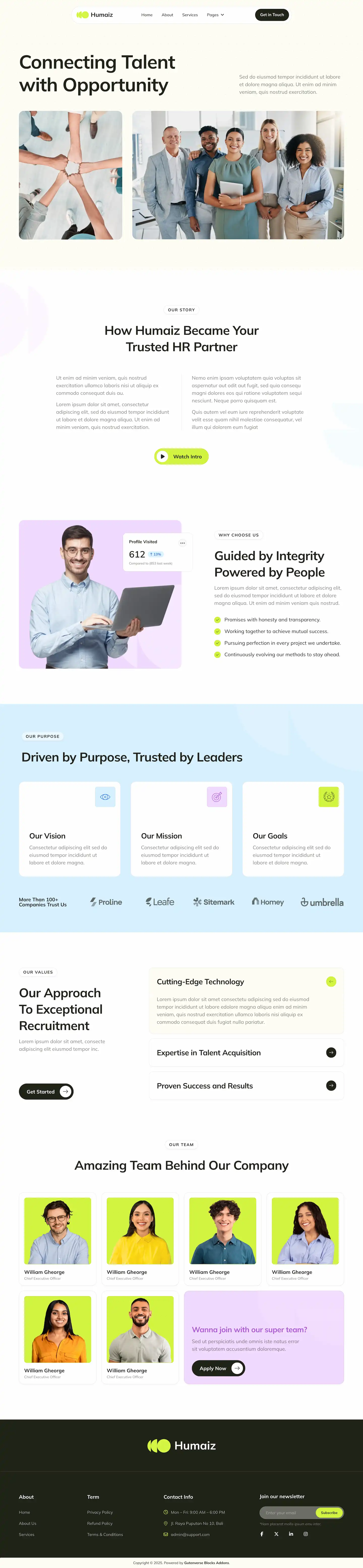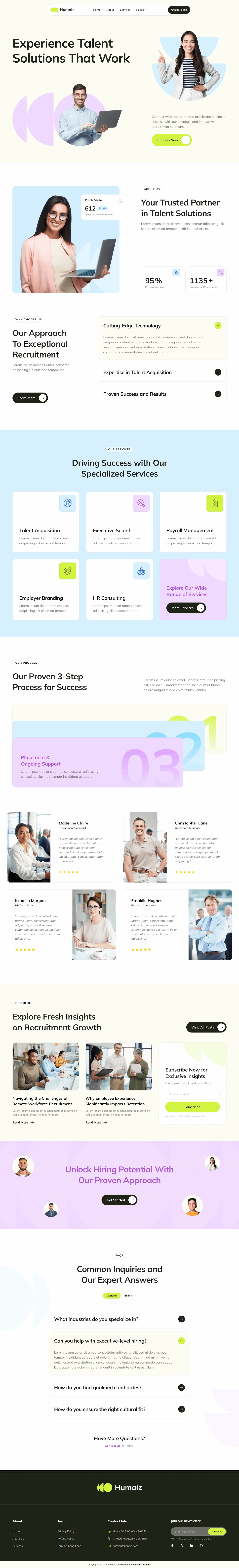 Humaiz offers a professional solution with a clean, modern design perfect for creating websites for Human Resources, Recruitment Agencies, Outsourcing Services, HR Advisors, and Hiring Managers. Humaiz is the ideal choice for building a trustworthy and efficient online presence that highlights your expertise and attracts the right talent.