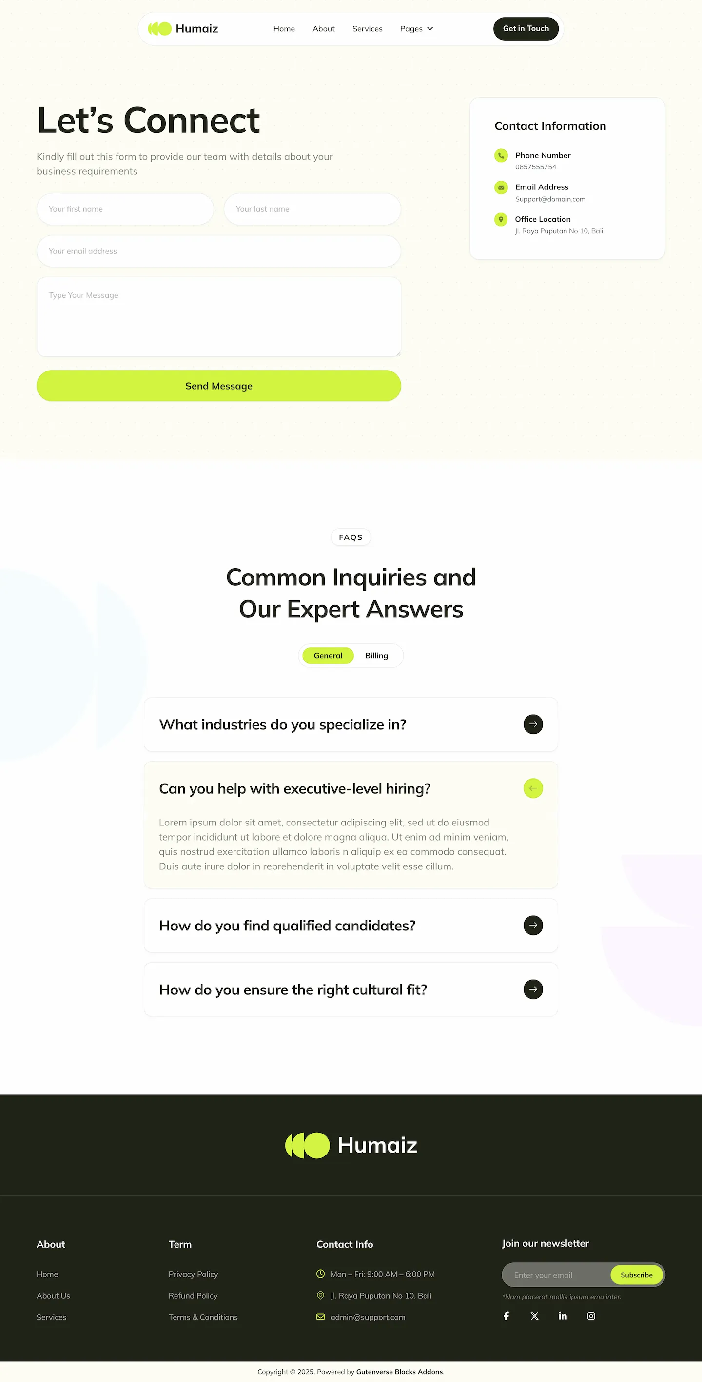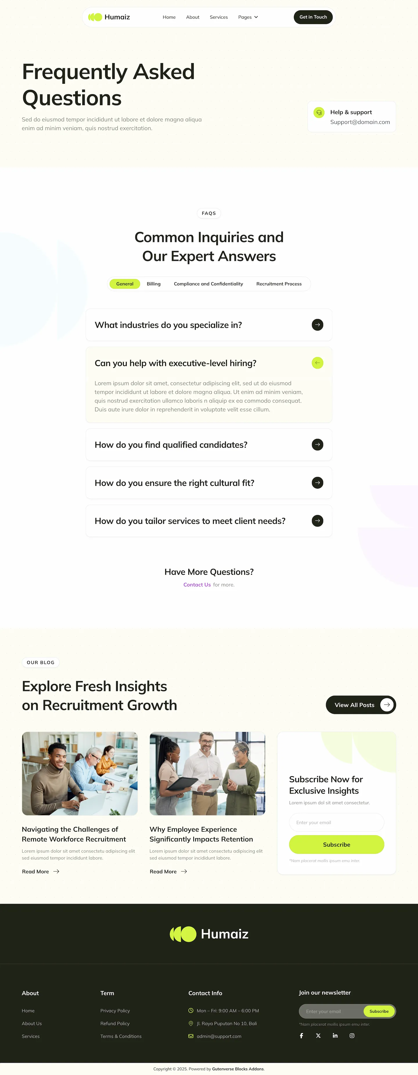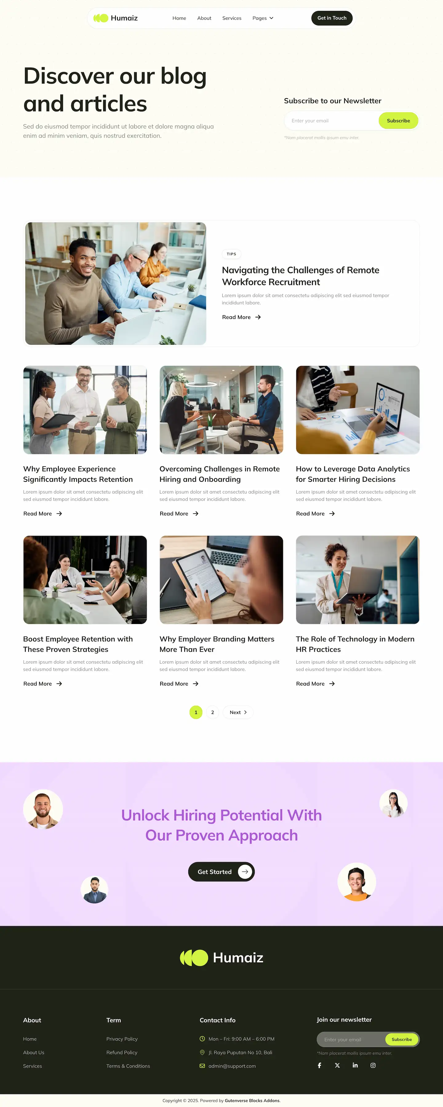 Humaiz offers a professional solution with a clean, modern design perfect for creating websites for Human Resources, Recruitment Agencies, Outsourcing Services, HR Advisors, and Hiring Managers. Humaiz is the ideal choice for building a trustworthy and efficient online presence that highlights your expertise and attracts the right talent.