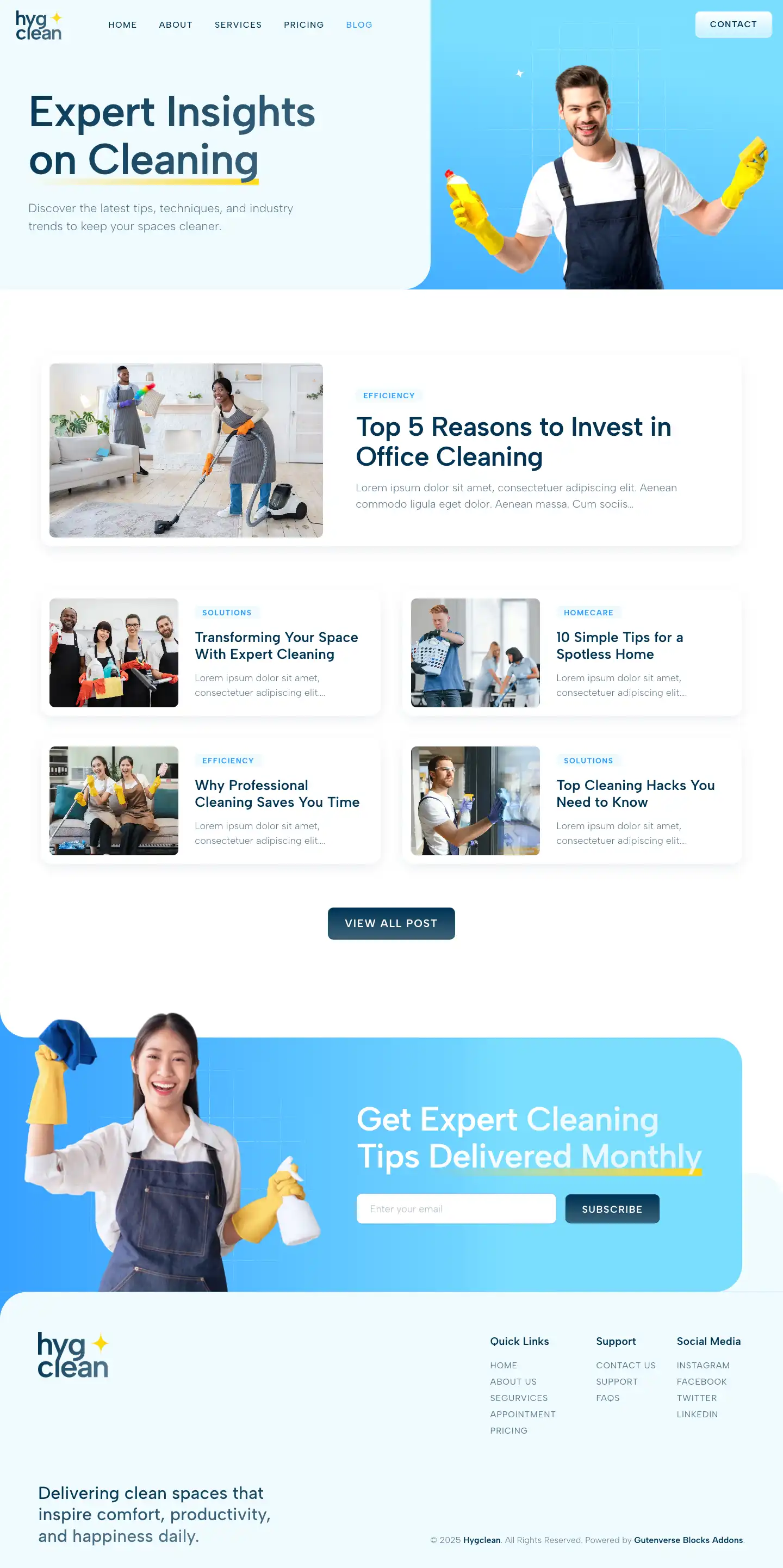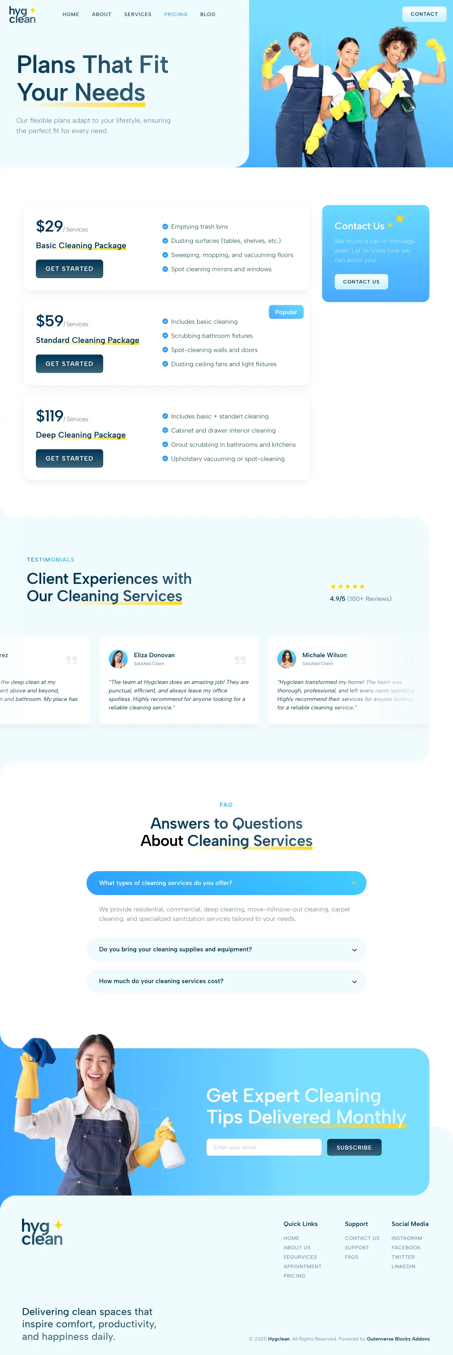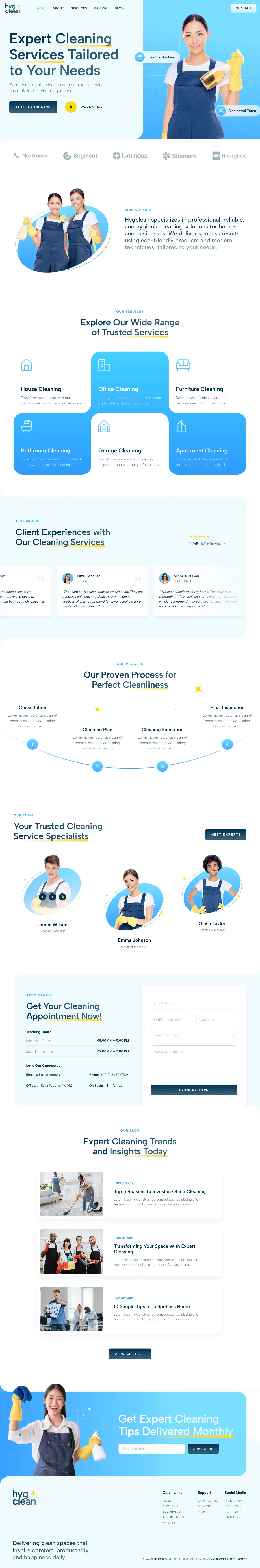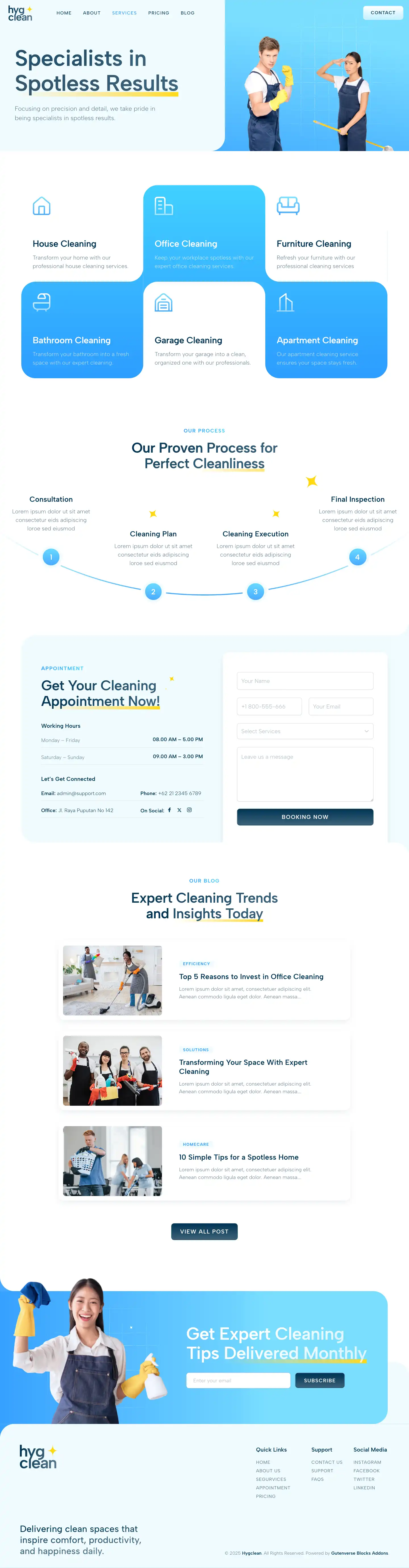 Hygclean offers a fresh and spotless design, perfect for building websites for cleaning service companies and maintenance providers. Ideal for residential cleaners, commercial cleaning services, janitorial companies, and specialized cleaning professionals. Hygclean helps you showcase your services, highlight your reliability, and create a clean and trustworthy online presence that attracts clients.