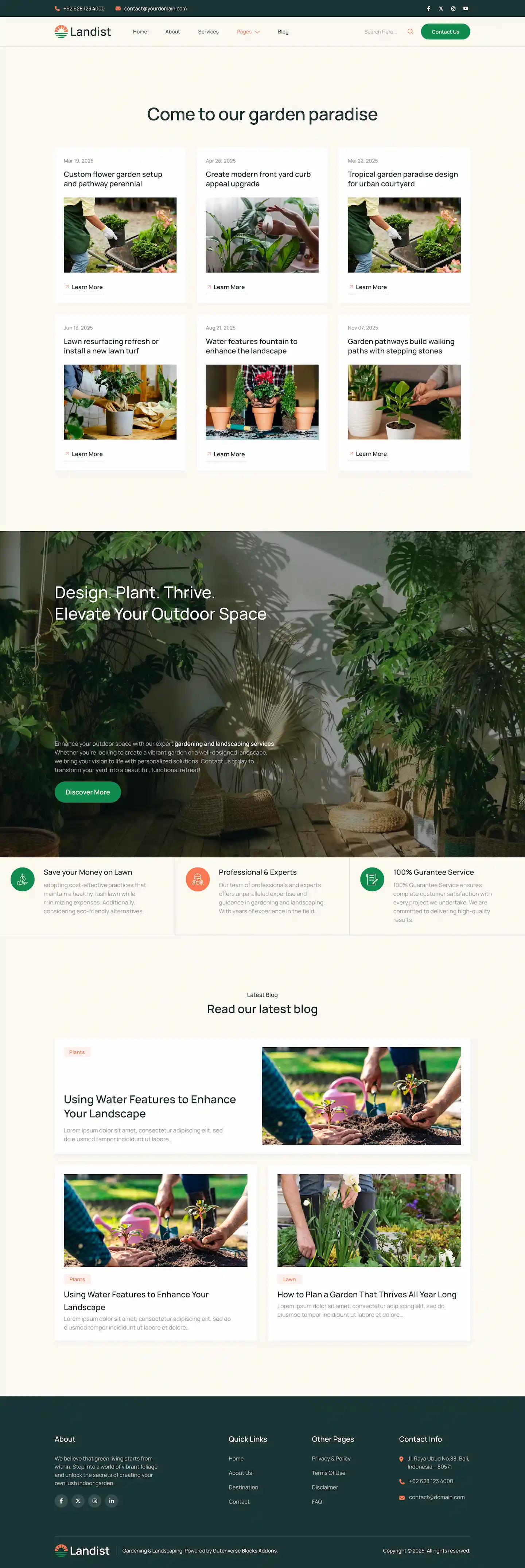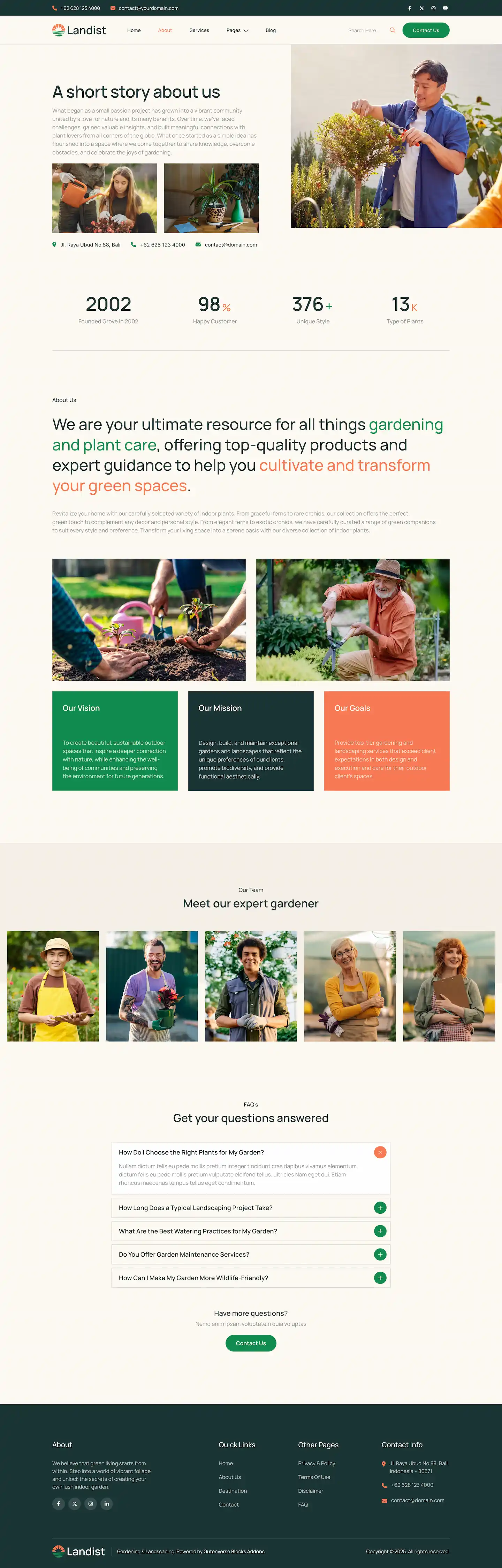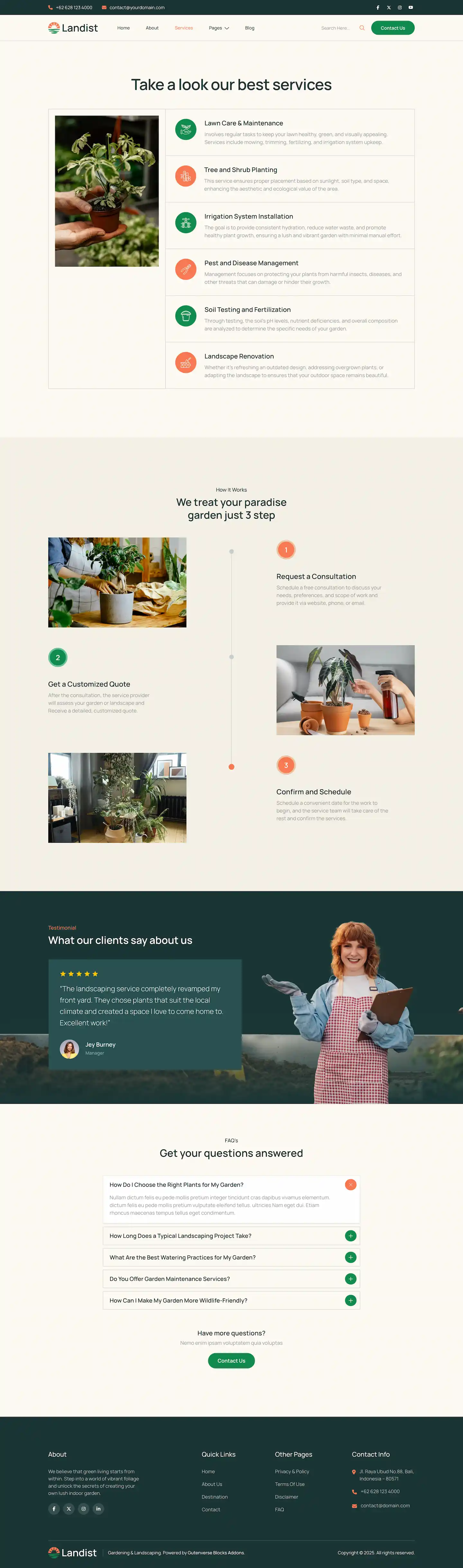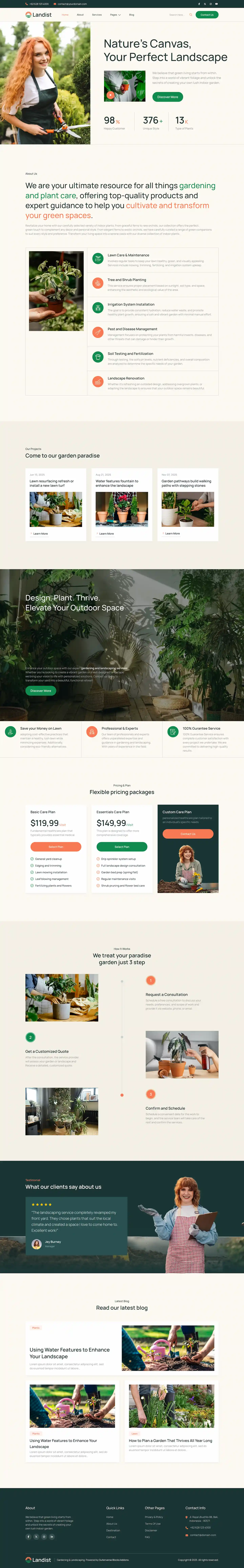 Landist offers an elegant and modern design, perfect for gardening, landscaping, and lawn care services. Ideal for landscape architects, gardening businesses, and agricultural professionals, Landist makes it easy to showcase your work, promote your services, and create a polished online presence. With its refined style and flexible features, it brings your outdoor creations to life in the digital space.