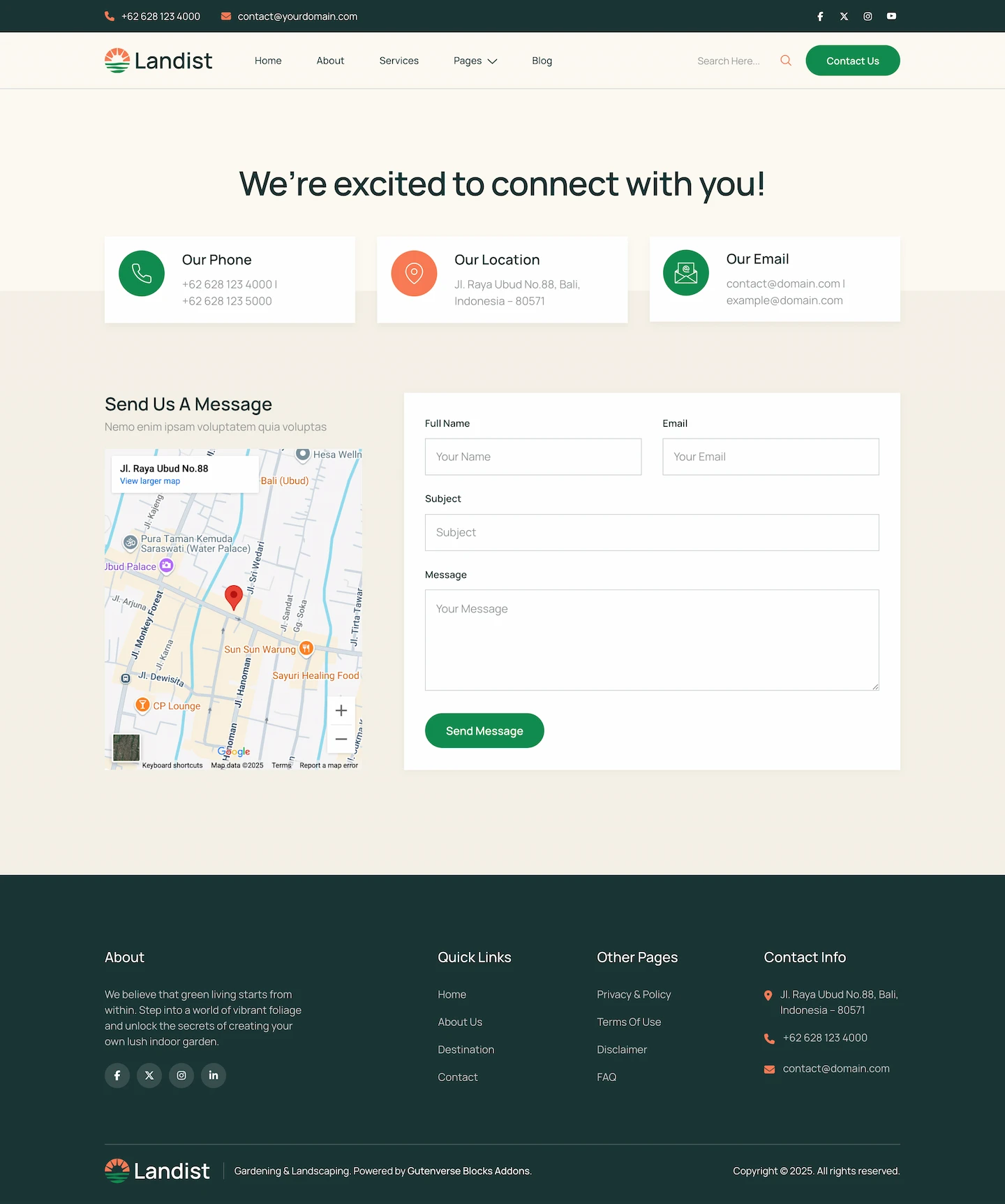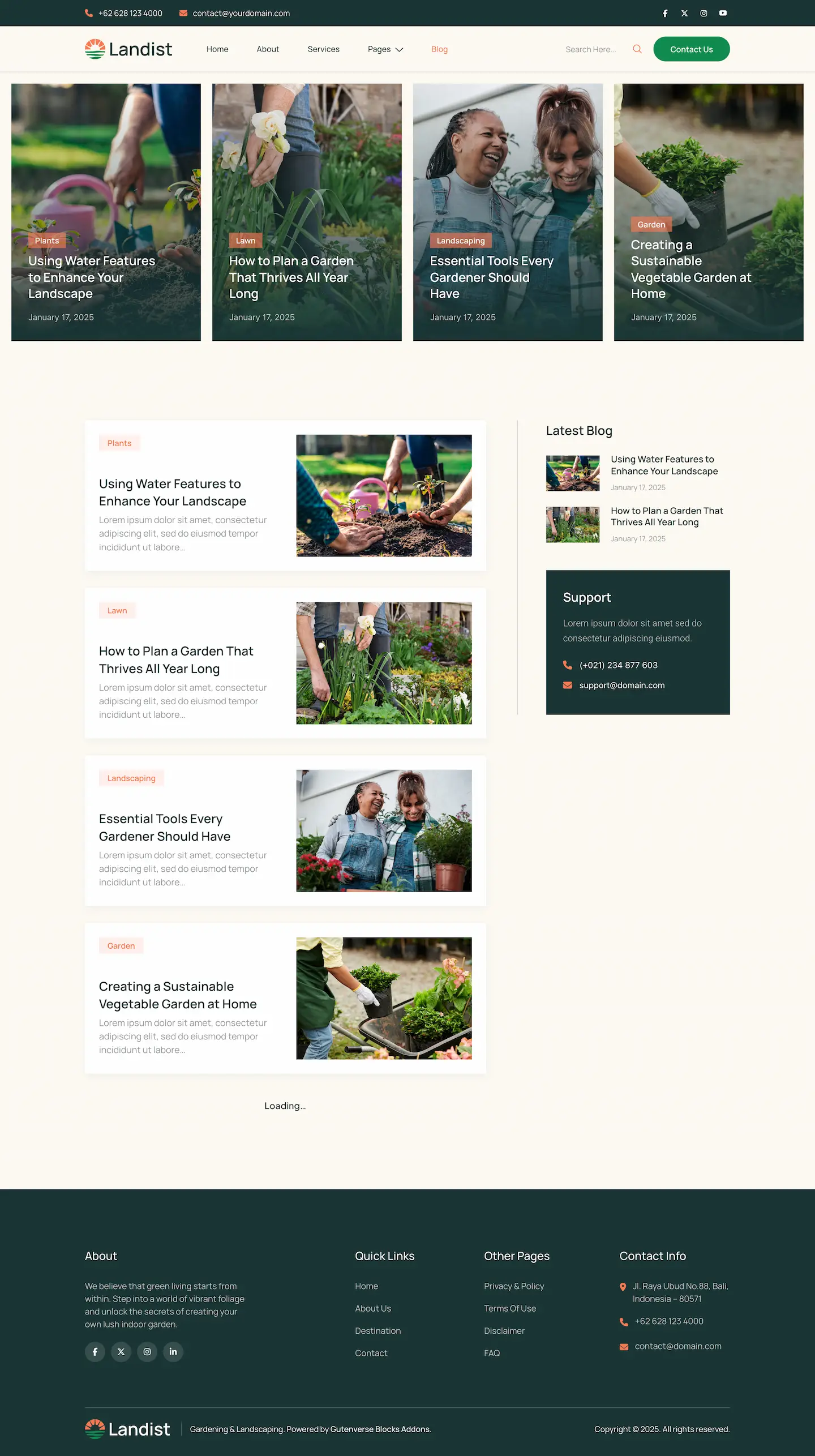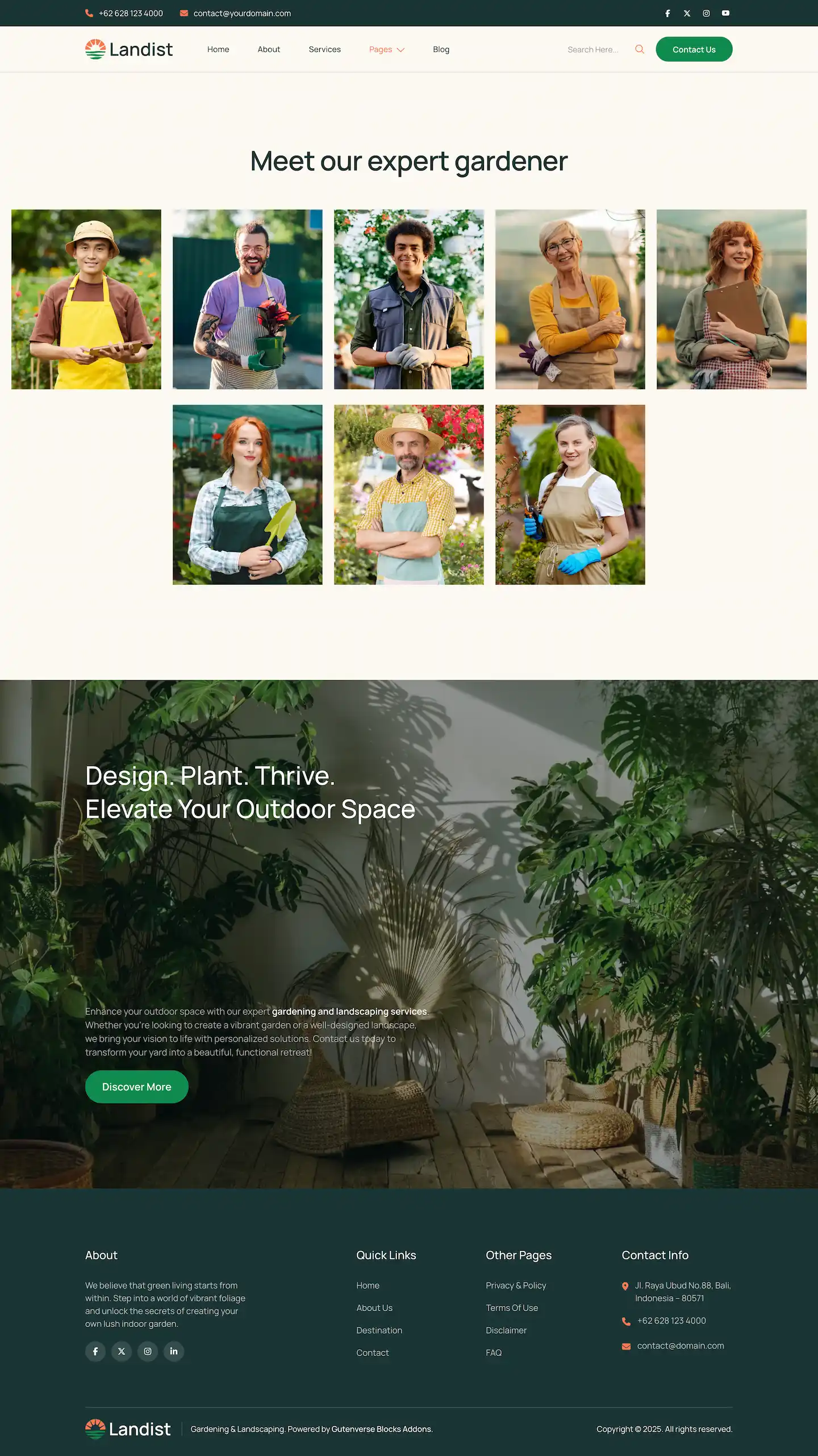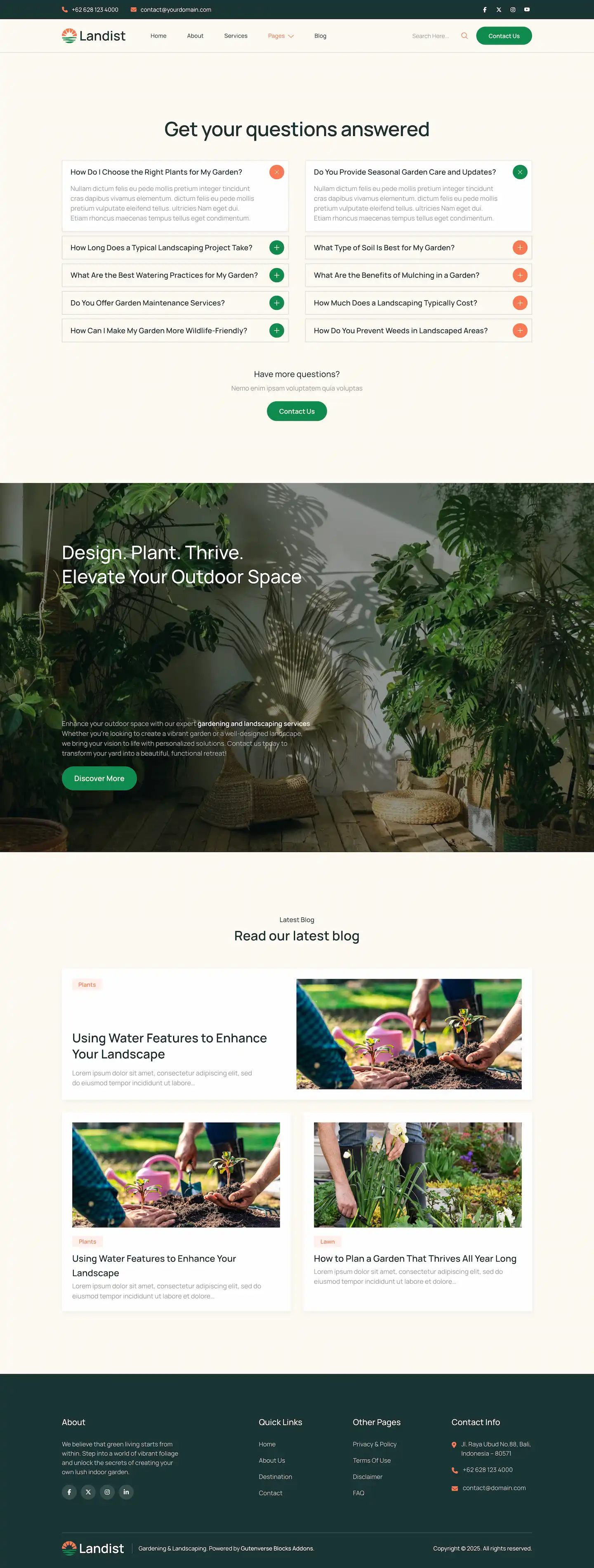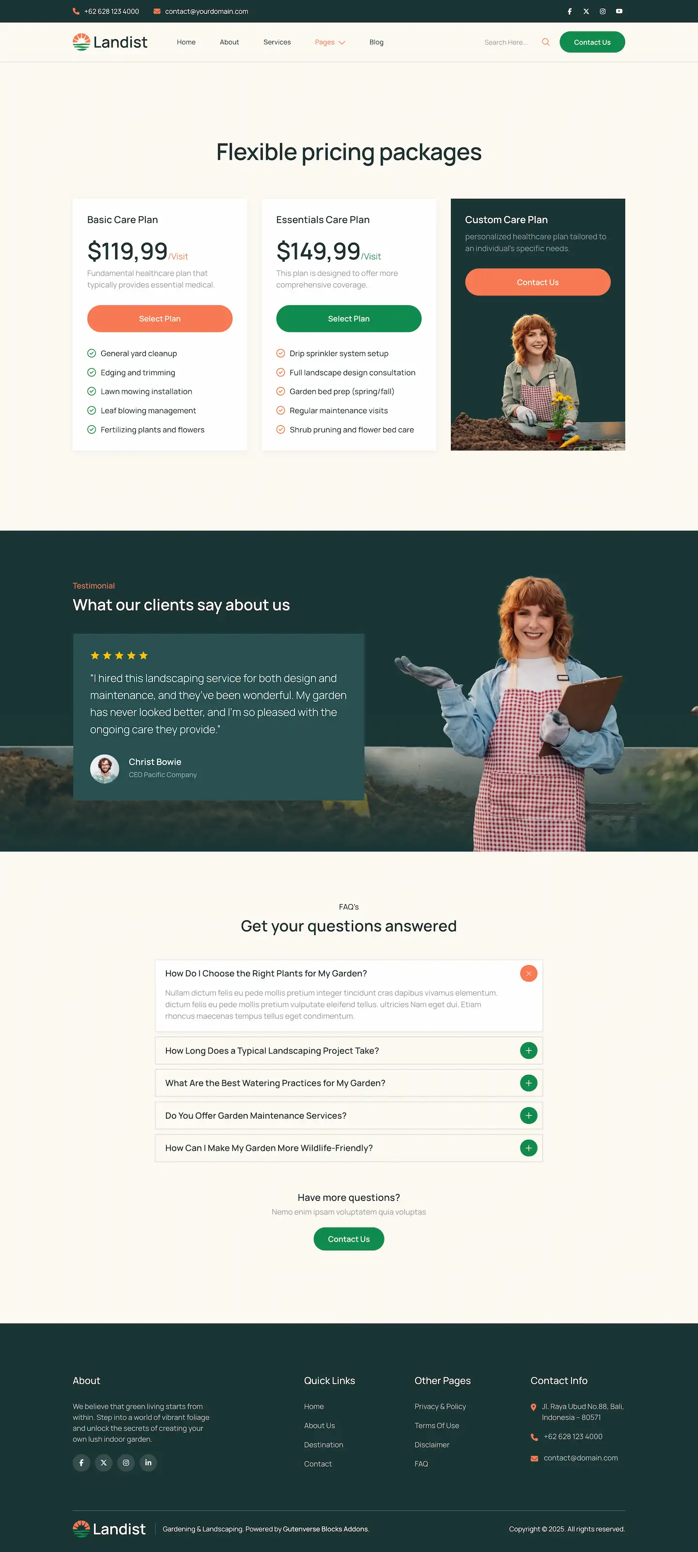 Landist offers an elegant and modern design, perfect for gardening, landscaping, and lawn care services. Ideal for landscape architects, gardening businesses, and agricultural professionals, Landist makes it easy to showcase your work, promote your services, and create a polished online presence. With its refined style and flexible features, it brings your outdoor creations to life in the digital space.