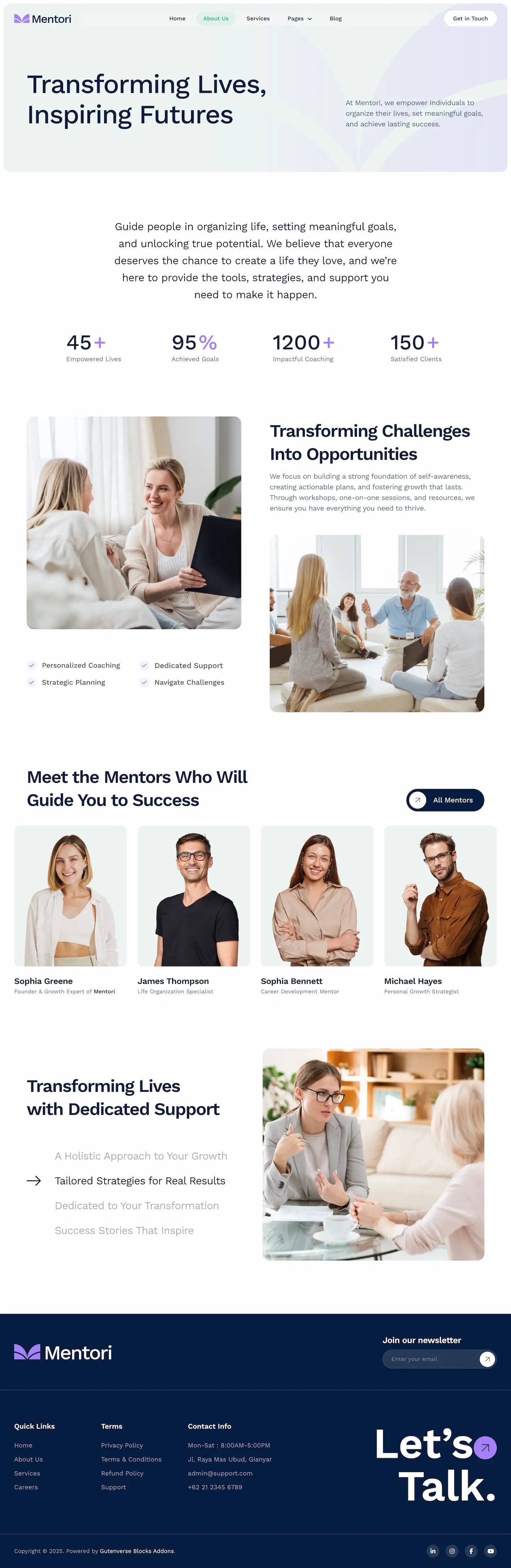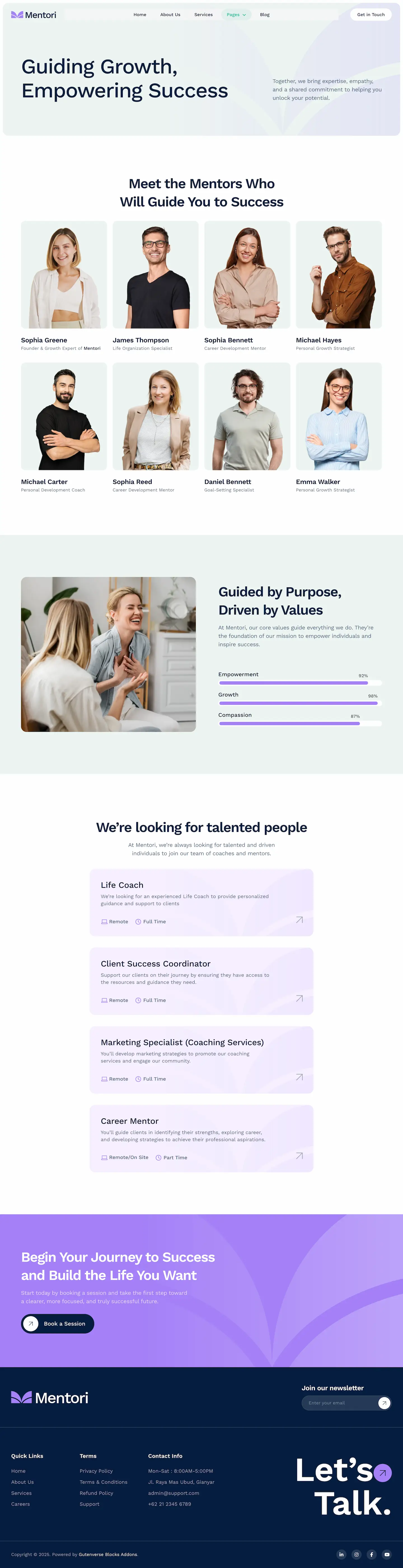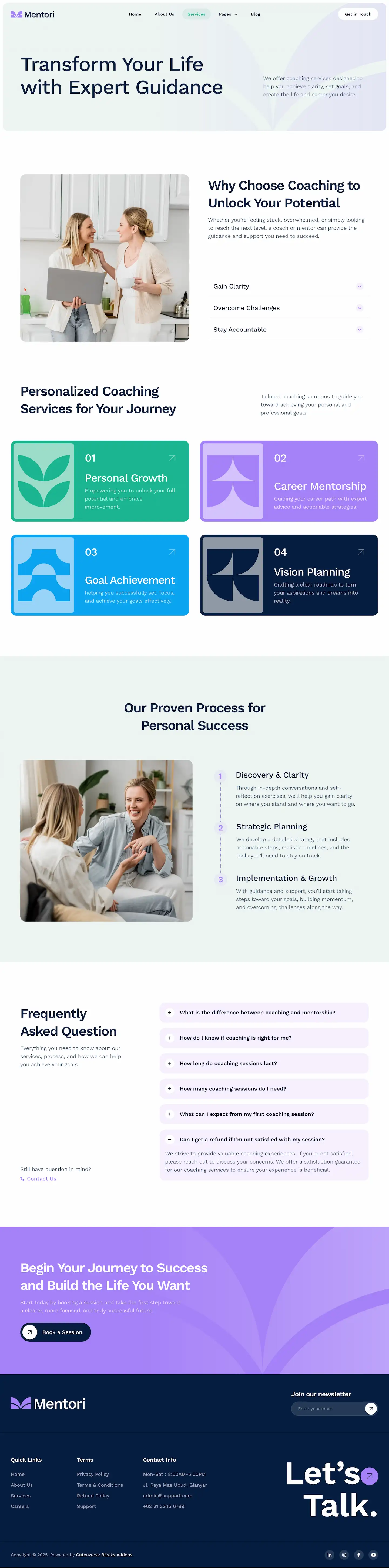 Mentori delivers a clean, modern design tailored for Life Coaches, Public Speakers, Workshops, Business and Personal Coaches, Career Consultants, and Mentoring services. It’s the perfect choice for building a confident and inspiring online presence that connects with your audience and builds credibility.