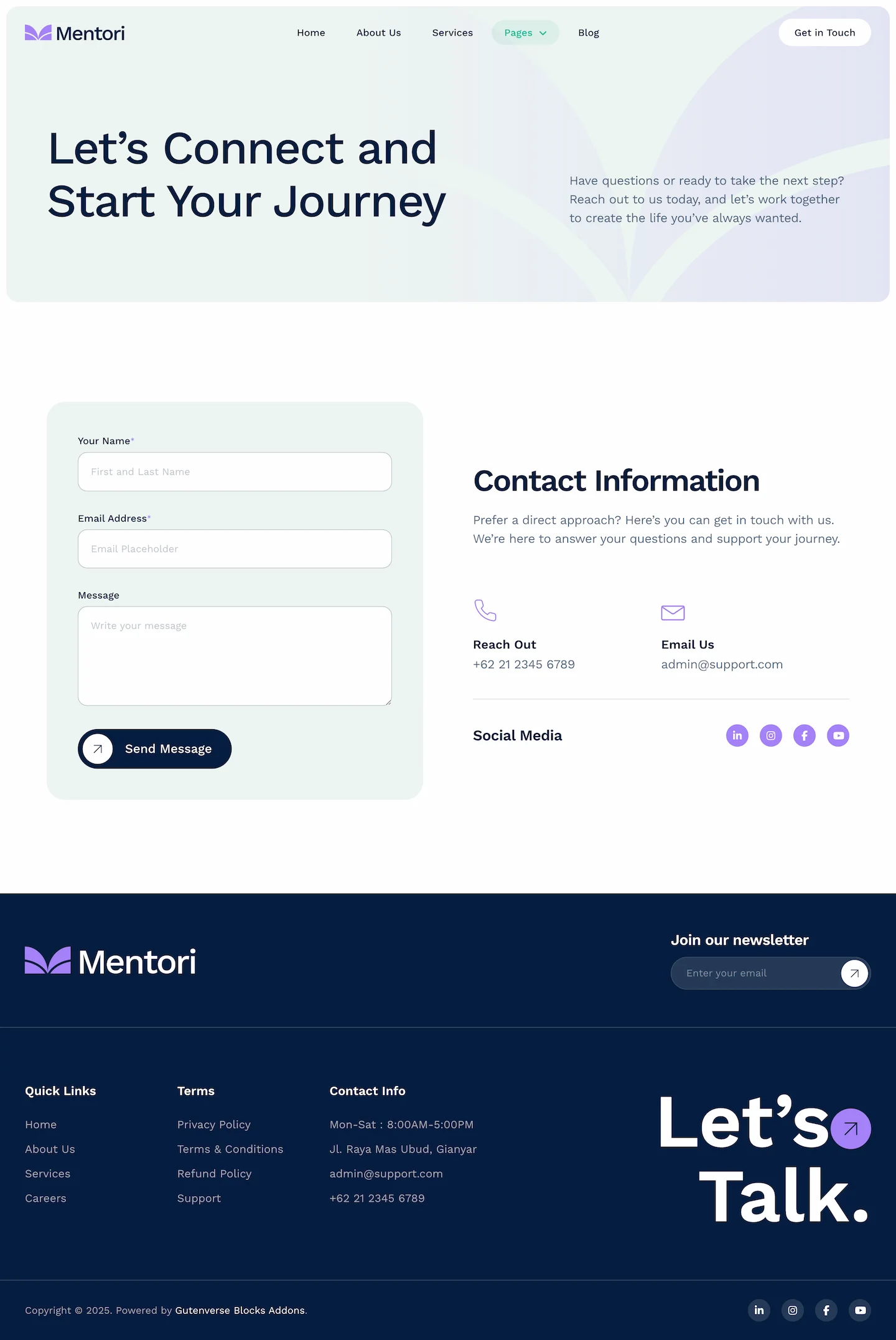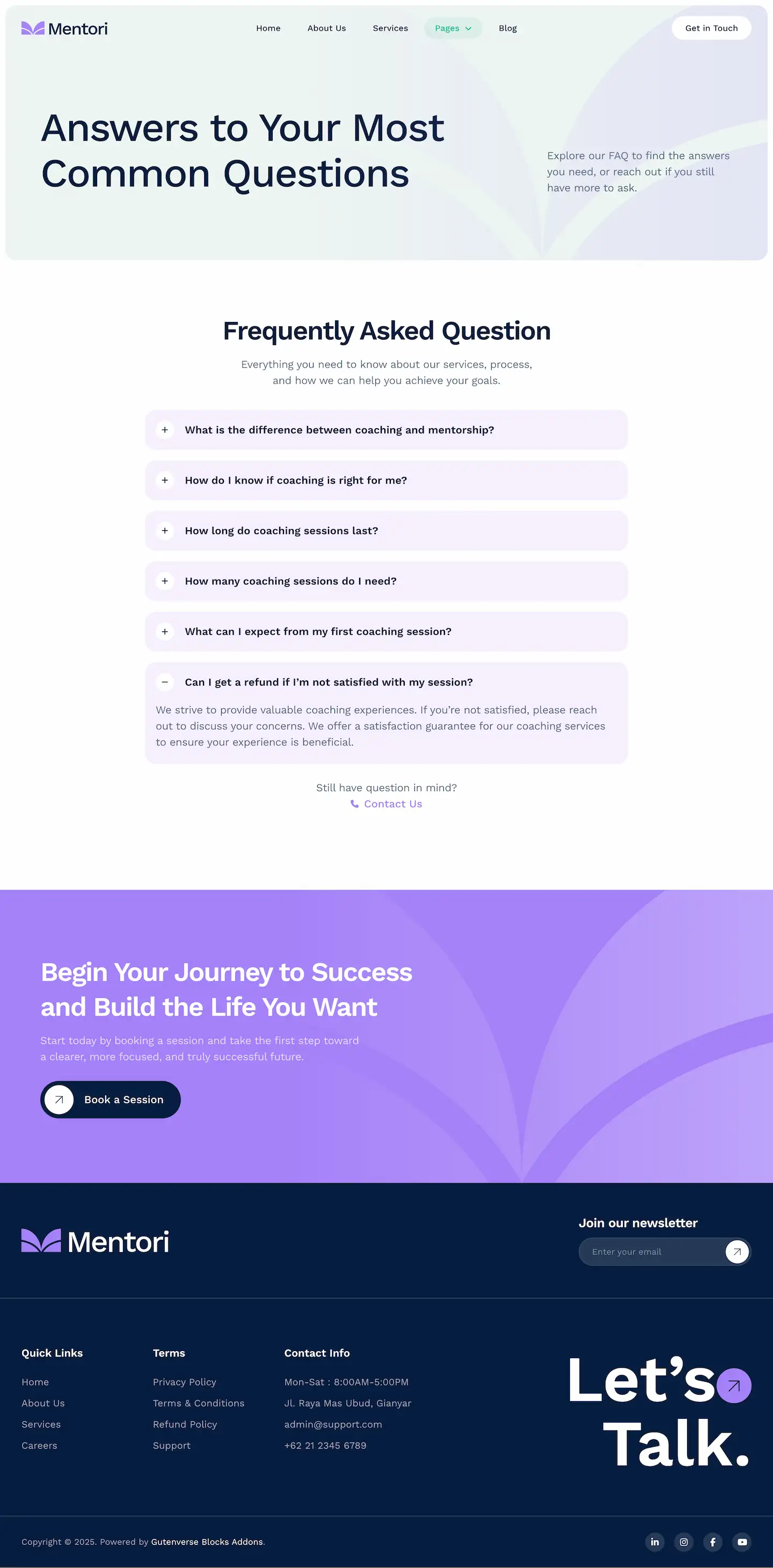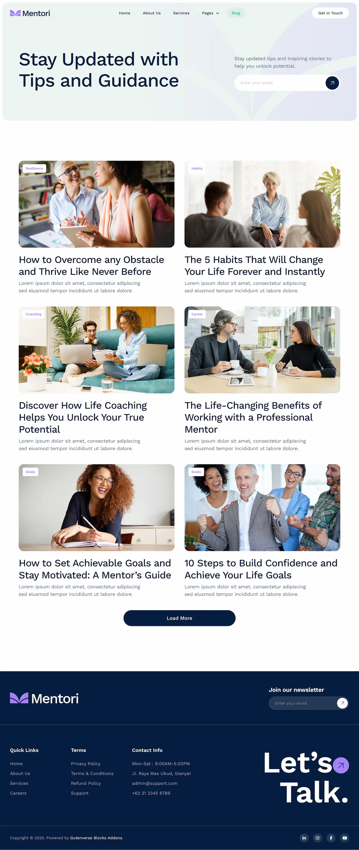 Mentori delivers a clean, modern design tailored for Life Coaches, Public Speakers, Workshops, Business and Personal Coaches, Career Consultants, and Mentoring services. It’s the perfect choice for building a confident and inspiring online presence that connects with your audience and builds credibility.