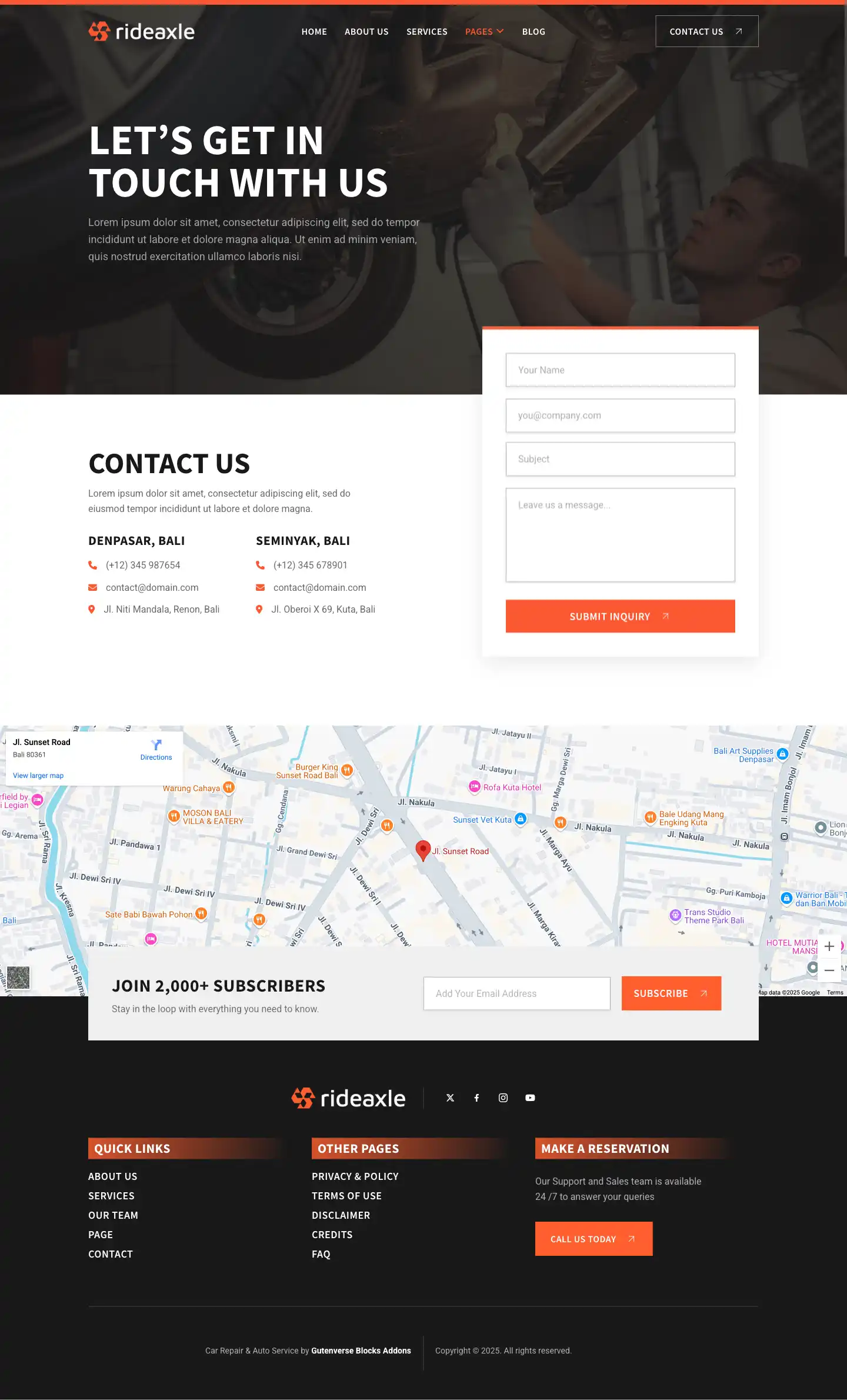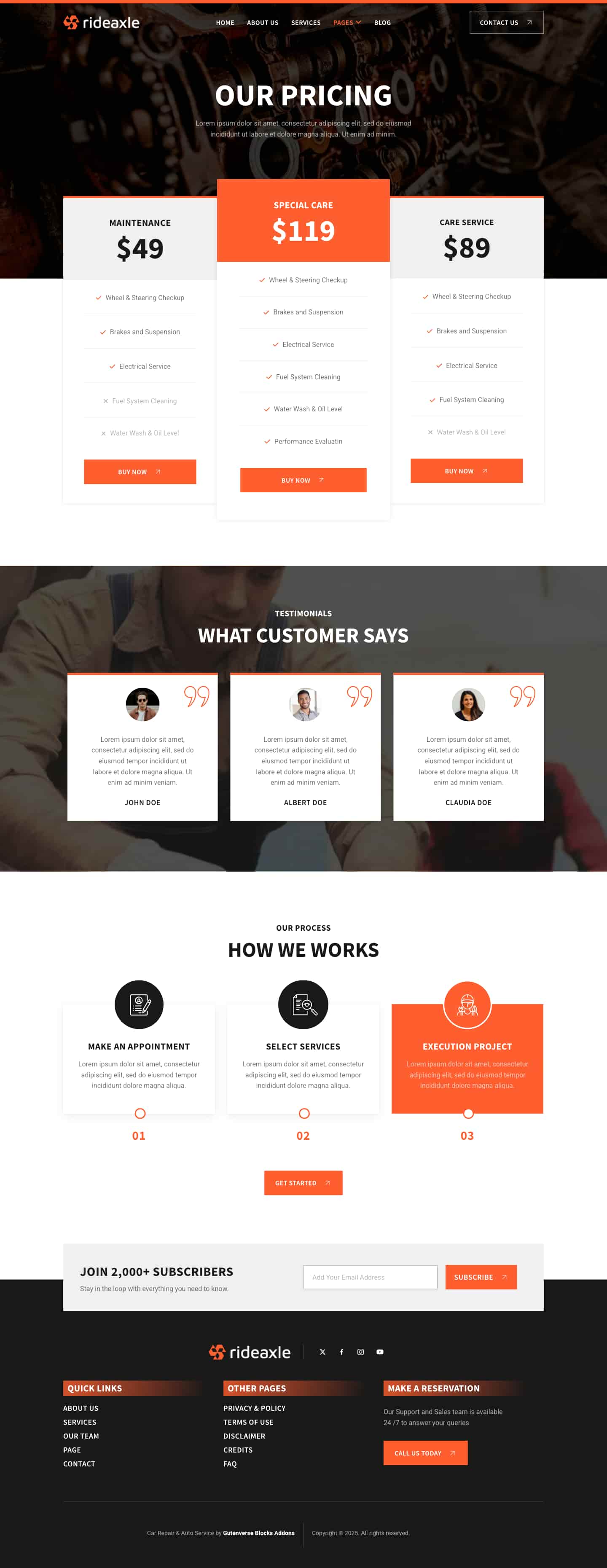 Rideaxle delivers a bold and professional design, perfect for creating websites for automotive repair and maintenance services. Ideal for auto repair shops, car service centers, mechanics, tire shops, and vehicle inspection services. Rideaxle helps you showcase your expertise, promote your services, and build trust with customers looking for reliable automotive care.