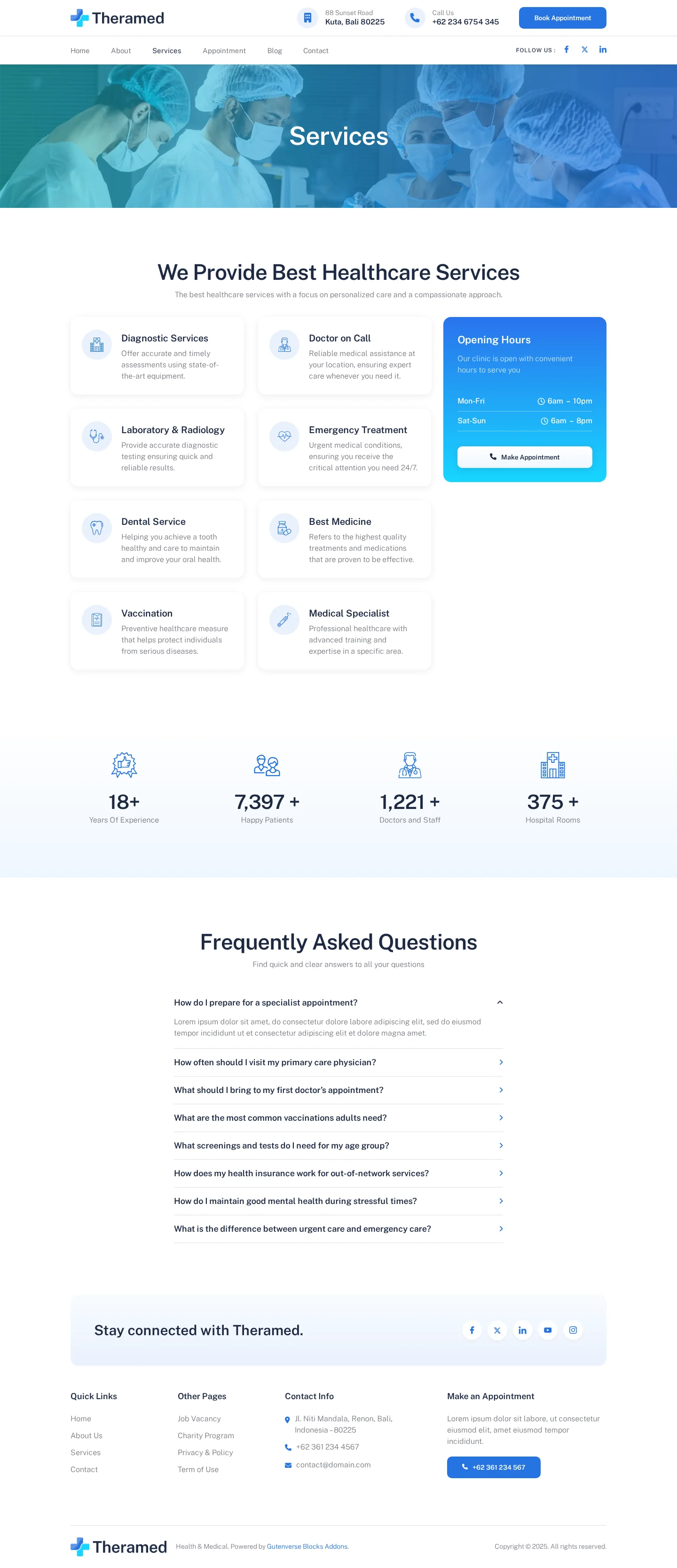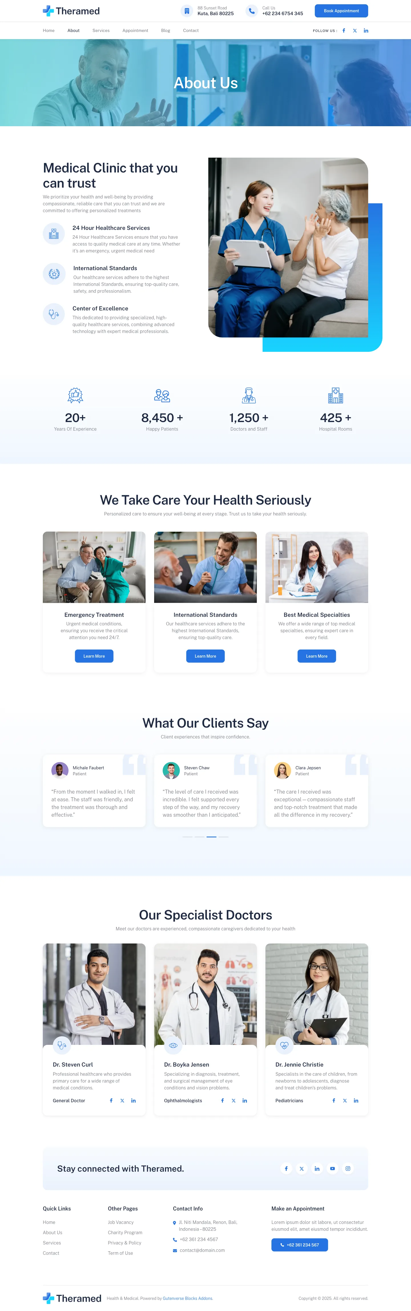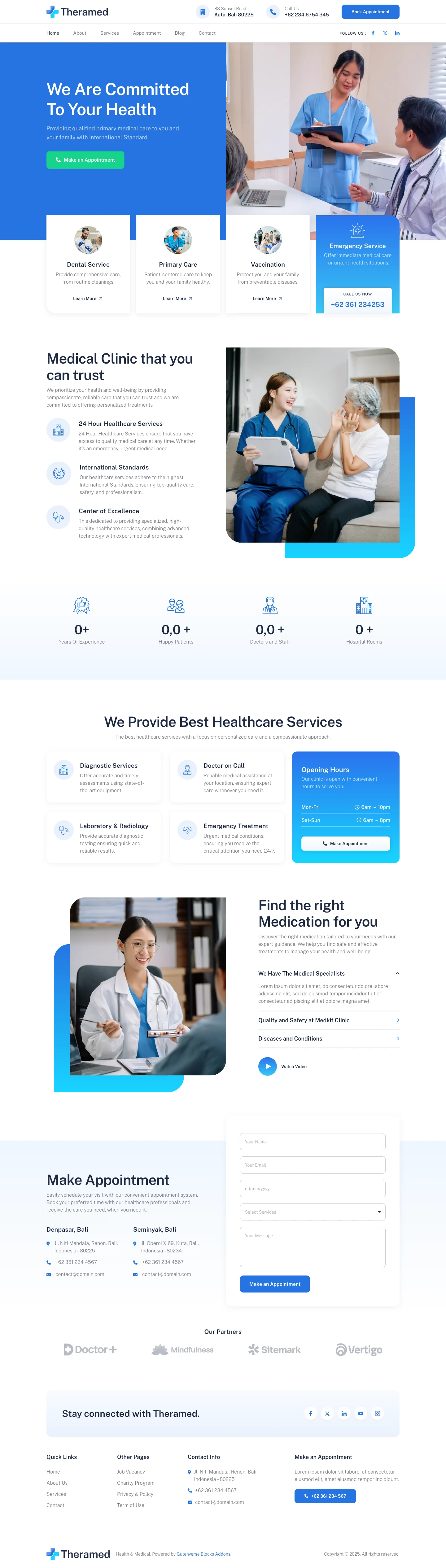 Theramed offers a clean and professional design, perfect for building trusted websites for healthcare and medical services. Ideal for clinics, doctors, dentists, physiotherapists, and wellness centers. Theramed helps you present your services clearly, build credibility with patients, and create a reassuring online presence for your practice.