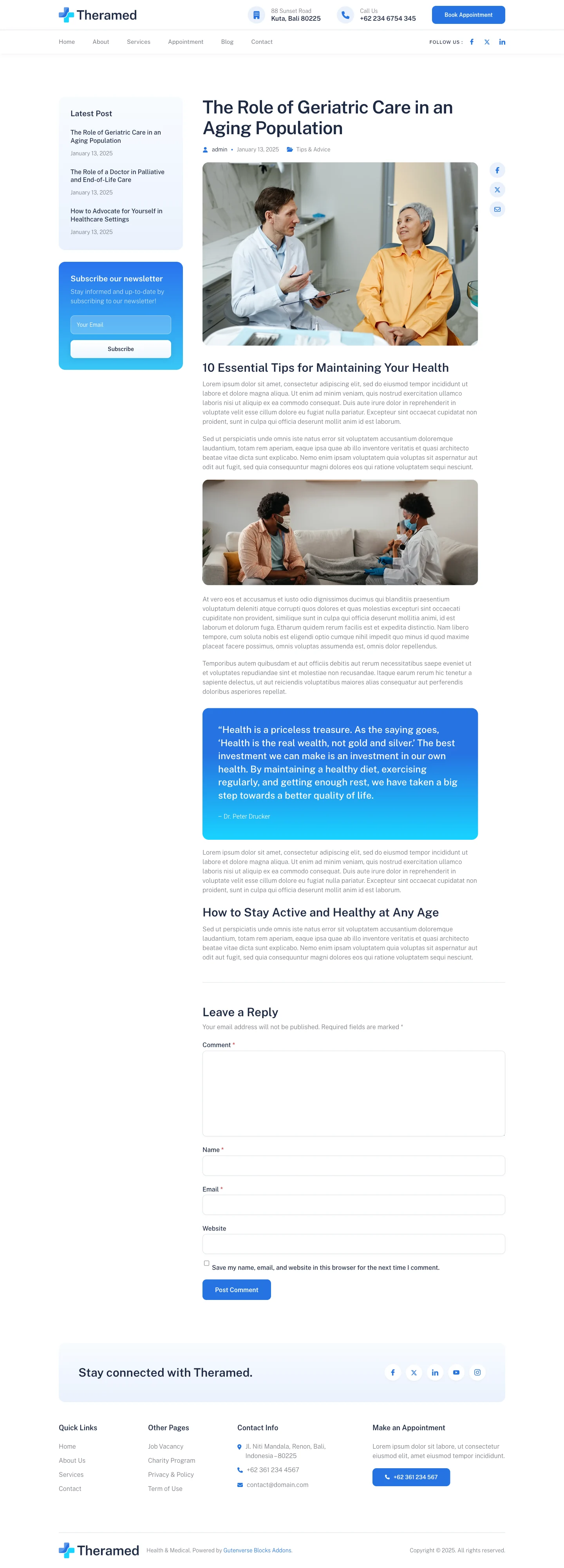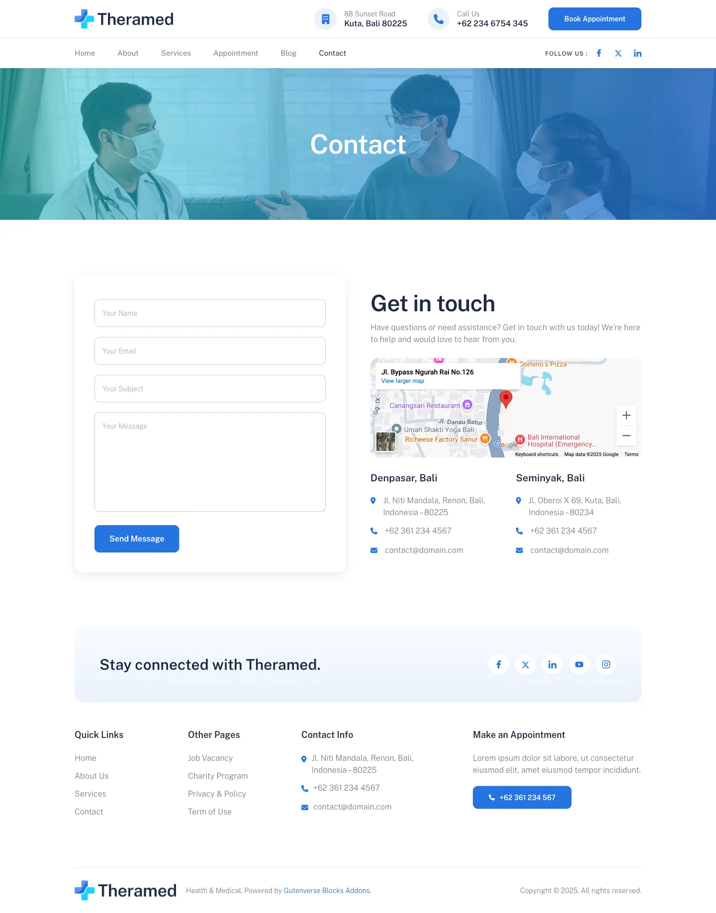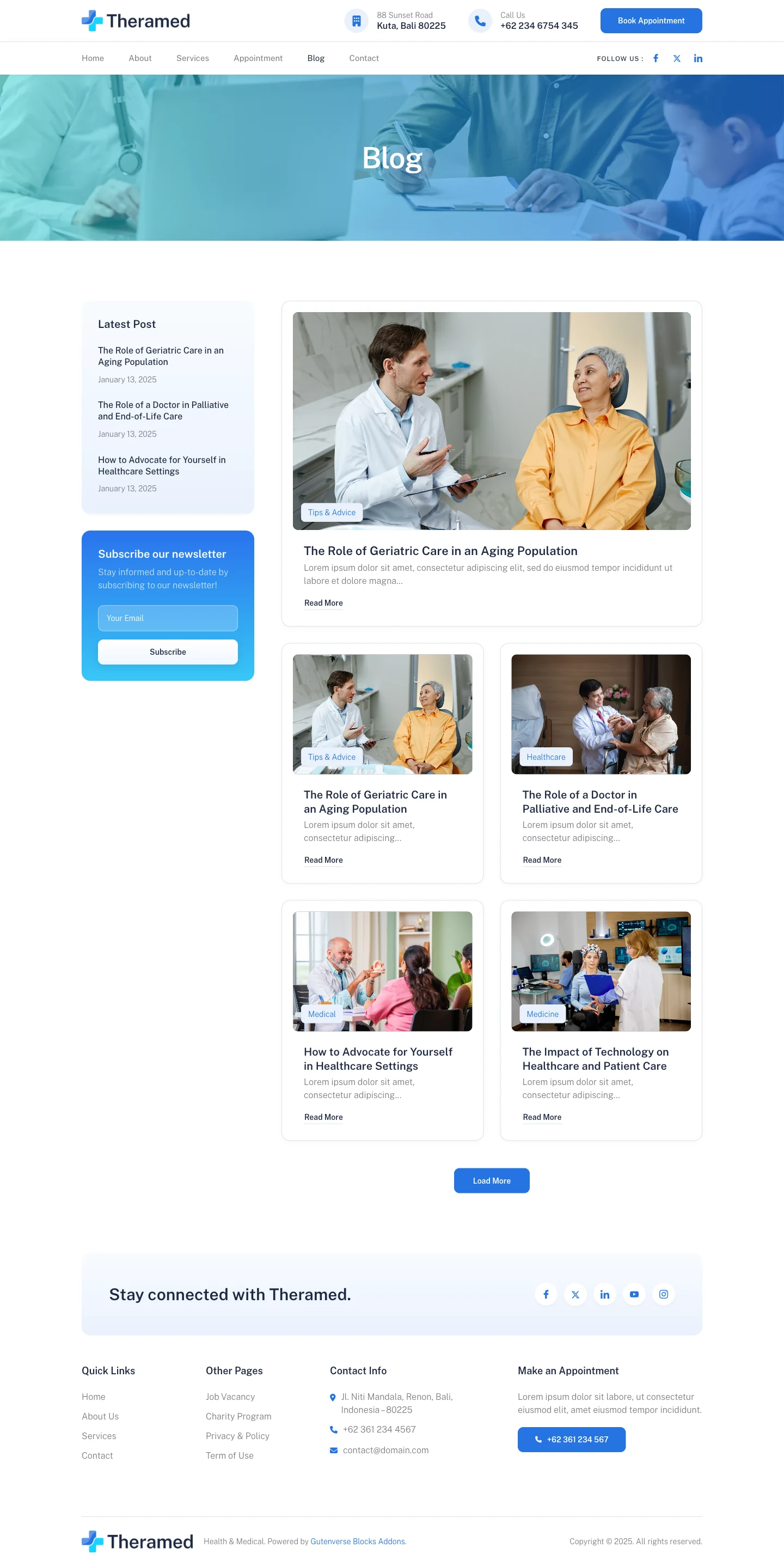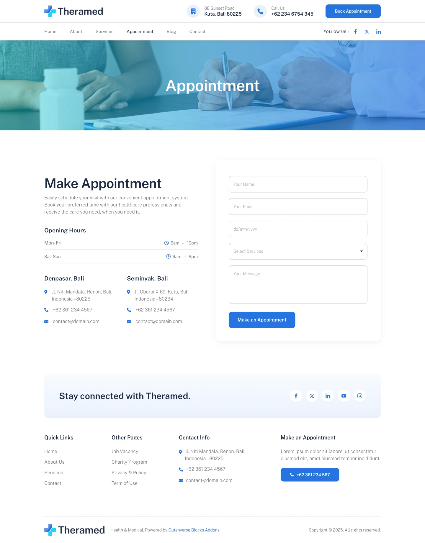 Theramed offers a clean and professional design, perfect for building trusted websites for healthcare and medical services. Ideal for clinics, doctors, dentists, physiotherapists, and wellness centers. Theramed helps you present your services clearly, build credibility with patients, and create a reassuring online presence for your practice.