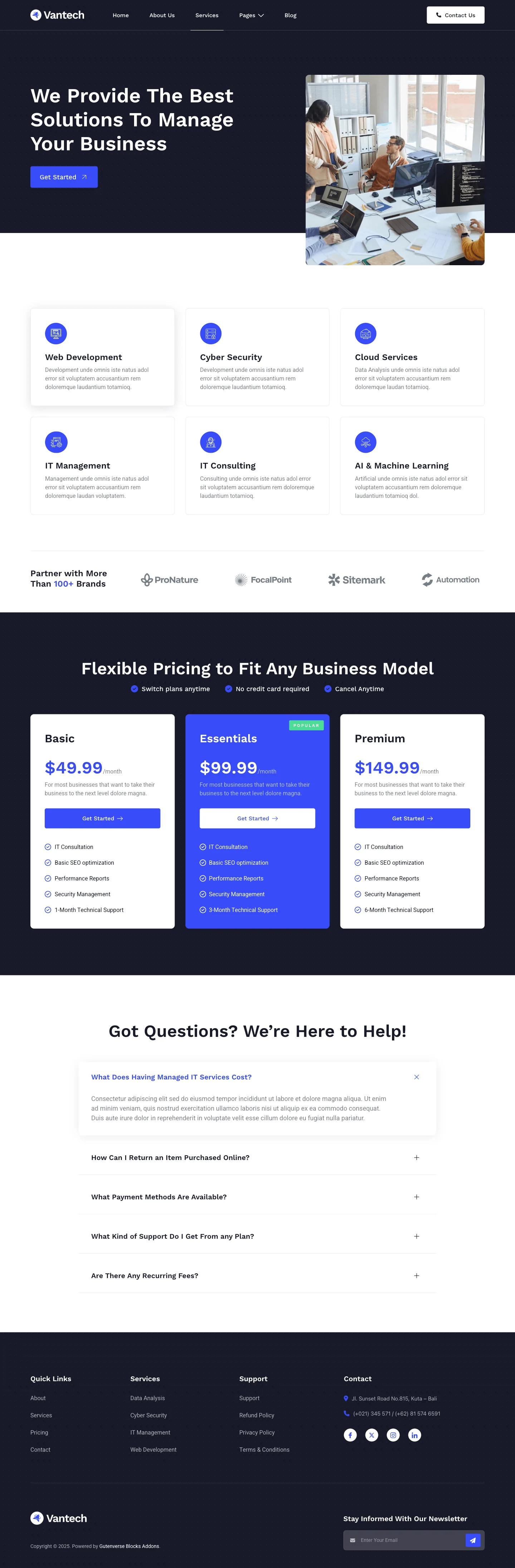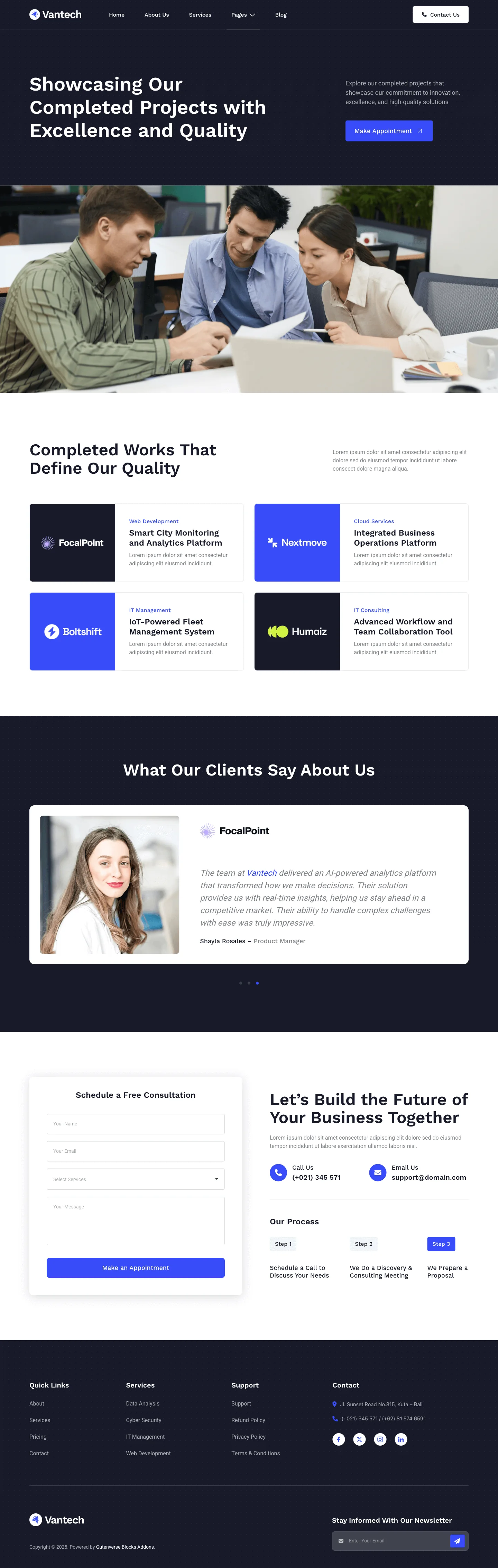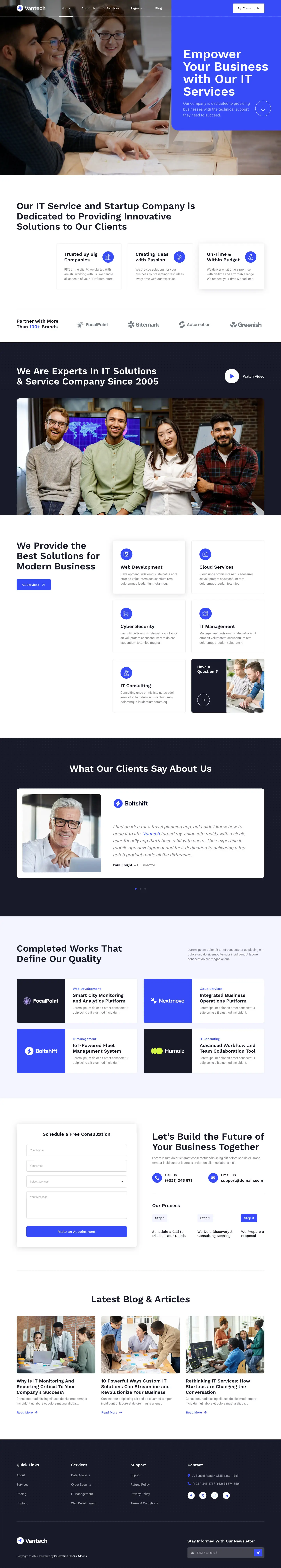 Vantech delivers a sleek and modern design, ideal for creating professional websites for IT solutions and service-based businesses. Perfect for tech companies, software providers, IT consultants, cloud service firms, cybersecurity experts, and digital transformation agencies. Vantech helps you present your technical expertise, build client trust, and position your brand as a reliable technology partner.
