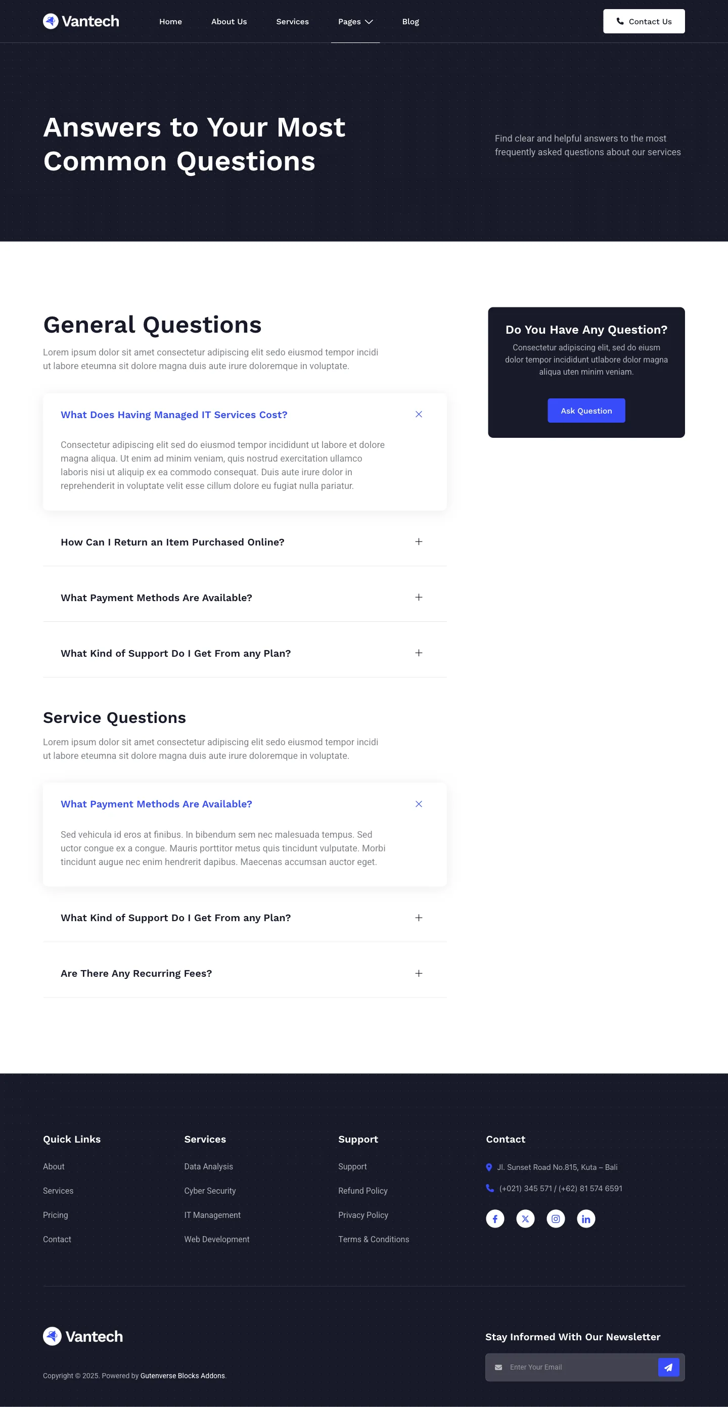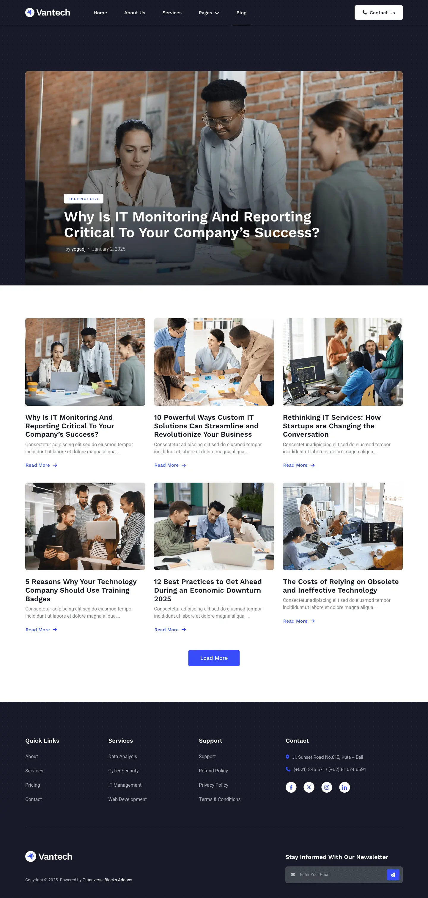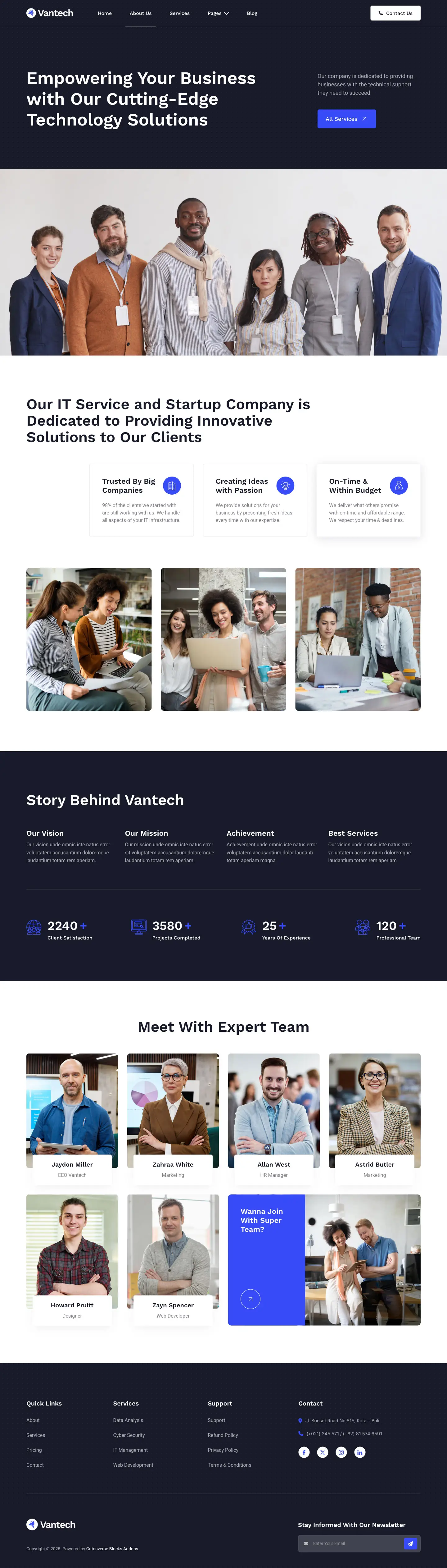 Vantech delivers a sleek and modern design, ideal for creating professional websites for IT solutions and service-based businesses. Perfect for tech companies, software providers, IT consultants, cloud service firms, cybersecurity experts, and digital transformation agencies. Vantech helps you present your technical expertise, build client trust, and position your brand as a reliable technology partner.
